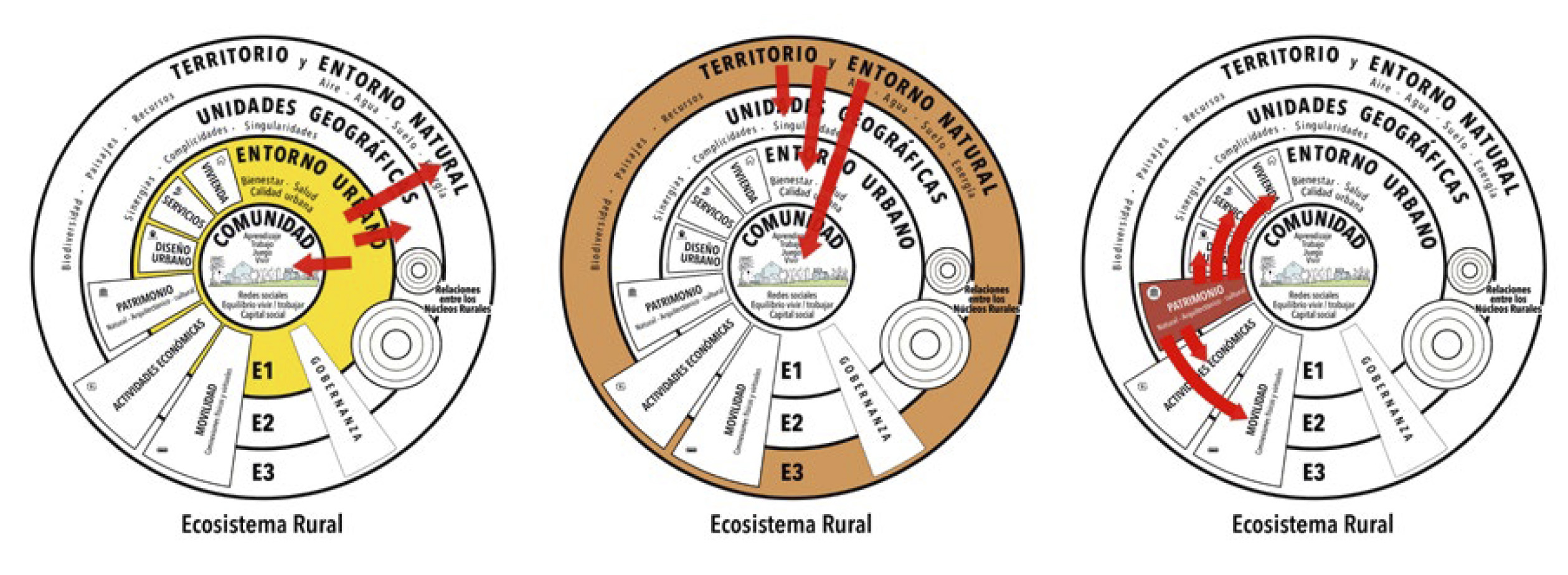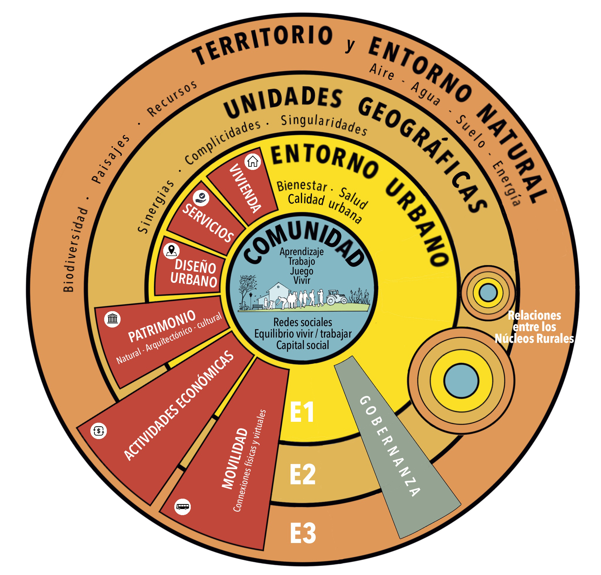 El concepto de ecosistema rural se puede representar mediante el gráfico de la Fig. 15, un modelo desarrollado por los autores a partir de las ideas de Dahlgren (1991) y Burton (2021). En el centro del ideograma se encuentra la comunidad, la unidad social básica, donde se desarrollan diferentes actividades vinculadas a la vida cotidiana, como los intercambios sociales, el aprendizaje, el trabajo o el ocio, y que se basan en las redes sociales presenciales y virtuales, el equilibrio entre vivir y trabajar, y que parten del capital social. El contexto físico en el que se desarrolla principalmente esta comunidad es el primer nivel escalar (E1), que corresponde al entorno urbano, y que podemos asociar mayoritariamente con el núcleo rural. Este contexto físico puede ser desde un caserío vinculado a los campos de cultivo (un edificio), un agregado de viviendas que puede generar una pequeña comunidad de unas 10 viviendas (aldea), un pequeño núcleo rural (alrededor de 300 habitantes), o un núcleo rural de mayor entidad (hasta unos 2500 habitantes aproximadamente). Estas comunidades tienen límites urbanos muy precisos, establecen vínculos muy importantes con el entorno inmediato y forman unidades antrópicas donde los conceptos de bienestar, salud o calidad urbana de los asentamientos son muy importantes.