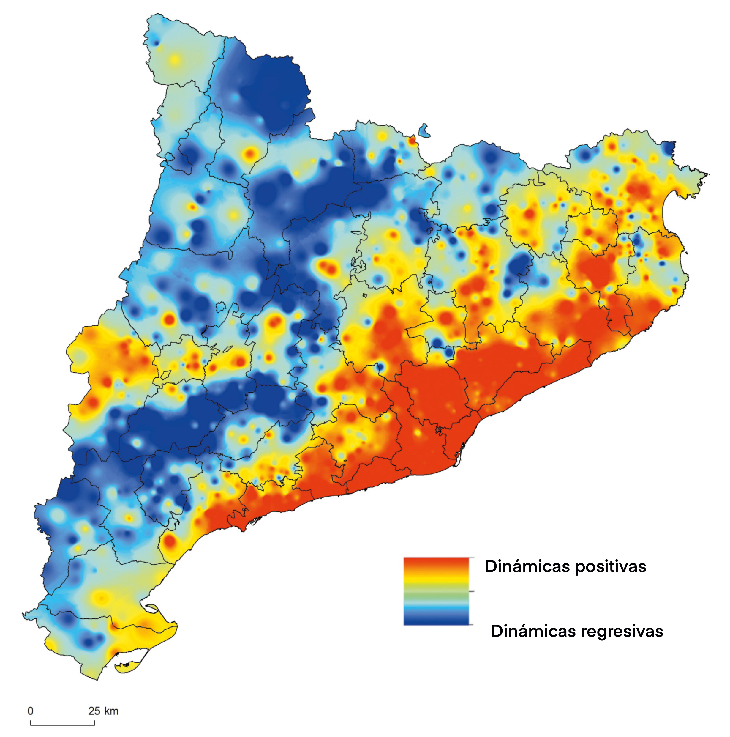 Pero obviamente el problema no es sólo la población, sino lo que se deriva de este parámetro. Si nos fijamos en un mapa que pretende explicar cuáles son las dinámicas económicas positivas y regresivas (en función de los datos de ocupación y la tasa de crecimiento económico en el periodo estudiado, así como de la evolución del PIB), podemos ver que más de la mitad del territorio catalán muestra escenarios preocupantes de decrecimiento, especialmente en entornos más rurales (Fig. 3). También hay que tener en cuenta que no da la impresión de que existan zonas intermedias, lo que permite hablar de dos “Cataluñas” muy diferentes: una poblada y económicamente enérgica, y la otra despoblada y recesiva. Esto pone de manifiesto la grave fractura que existe entre los núcleos rurales y los núcleos urbanos de nuestro territorio, ya que si este vínculo o las sinergias entre ambas realidades se vieran mínimamente obstaculizadas, encontraríamos muchos más episodios de transición entre ellos; en otras palabras, habría muchos más colores amarillos y verdes de los que podemos ver en el gráfico.