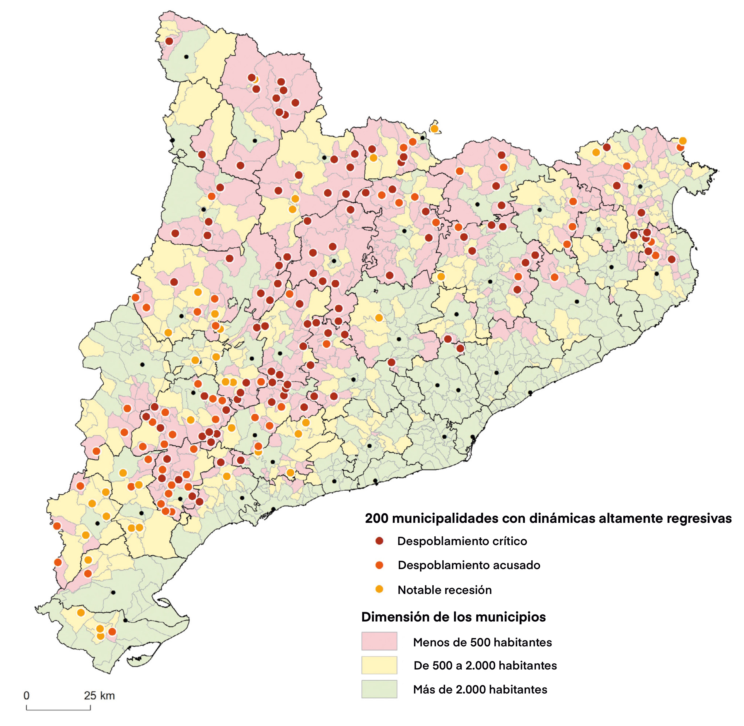 El motivo para la elaboración de este documento se basa en la preocupación que despierta una simple mirada a los municipios catalanes que tienen dinámicas económicas muy regresivas, y que sufren problemas de despoblación. Si observamos el gráfico de la Fig. 1, podemos darnos cuenta de la magnitud del problema al reconocer cómo una gran parte del territorio muestra muchos municipios en episodios regresivos (a partir de datos socioeconómicos), con sustratos en los que la población está envejecida y donde su actividad económica es escasa. Por ello, es necesario reflexionar sobre esta realidad, leerla con detenimiento, diagnosticar sus patologías y buscar estrategias para revertir estas tendencias y reequilibrar adecuadamente el territorio bajo los criterios de sostenibilidad ecológica, dinamización económica y cohesión social (Olmedo, 2023).
