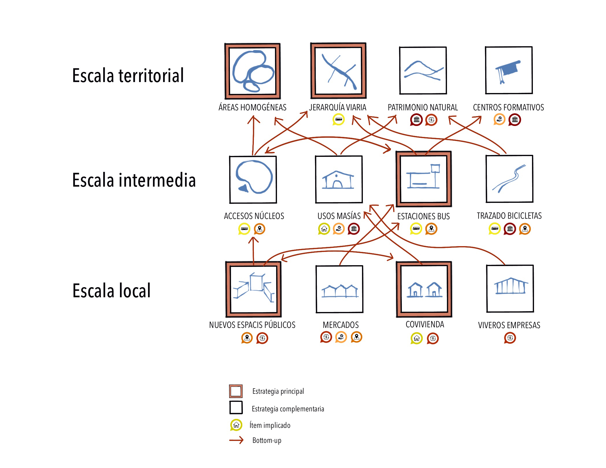 Estos enfoques que venimos discutiendo deben abordar, al mismo tiempo y simultáneamente, las diferentes cuestiones clave en las que hay que incidir si queremos intervenir eficazmente sobre la complejidad de los territorios rurales (Fig. 14). Estos temas o principios urbanos deben enriquecer el discurso sobre los nuevos equilibrios e interacciones territoriales entre asentamientos urbanos y rurales, y son: movilidad, vivienda, servicios, espacio público, actividades y patrimonio. Es fundamental, por tanto, una mirada transversal a cada uno de estos 6 ítems, y también entender sus interrelaciones, ya que solo desde una visión concomitante y sincrónica de estos elementos podemos entender esta complejidad rural, y podemos establecer estrategias que realmente sumen exponencialmente y así garantizar propuestas mucho más efectivas y palpables.