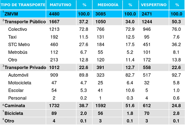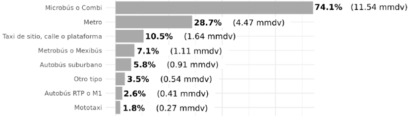 Encuesta Origen Destino en Hogares de la Zona Metropolitana del Valle de México, 2017. 1 La suma por modo de transporte utilizado, puede ser mayor que su total correspondiente, debido a que una persona puede emplear más de un modo de transporte. 2 El porcentaje de los transportes se obtiene con respecto al total de transporte público.3 El porcentaje de los transportes se obtiene con respecto al total de transporte privado. 4 Se consideran tramos de caminata de cualquier duración cuando el viaje se realizó únicamente de este modo. 5 Debido a la forma en que se captó la bicicleta, no es posible distinguir si es transporte público o privado.6 En la categoría “Otro” se incluye trajinera y lancha, entre otros. Matutino, mediodía y vespertino hacen referencia a las horas de la mañana, del mediodía y de la tarde, respectivamente