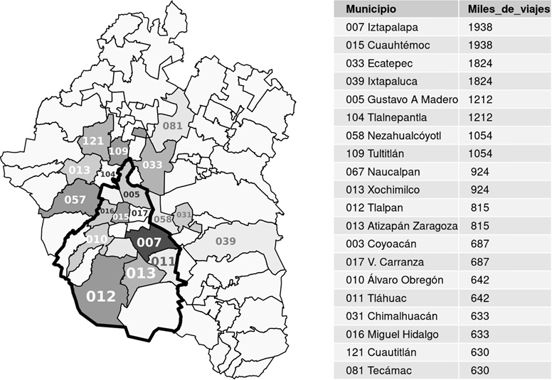 Para comprender la problemática de movilidad referida, es necesario considerar los municipios y alcaldías en donde se realizan la mayor cantidad de viajes per cápita, entre los que se encuentran primeramente las alcaldías de Iztapalapa, Cuauhtémoc y Gustavo A. Madero, que son entidades centrales a partir de la intensidad de traslados por cuestiones laborales. En tanto que en el Estado de México destacan los municipios de Ecatepec, Ixtapaluca, Tlalnepantla, Nezahualcóyotl y Tultitlán, los cuales además de concentrar una densidad poblacional importante, están relacionados con fuentes de trabajo industrial, así como con desarrollos habitacionales a gran escala, en donde se localiza una población que generalmente tiene que realizar largos trayectos para poder llegar a sus centros educativos o de trabajo (Fig. 4).