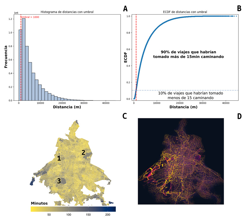 El análisis se fundamentó en un conjunto de datos de desplazamientos origen-destino correspondiente al periodo del 15 de enero al 14 de febrero de 2020, excluyendo los fines de semana. El total de desplazamientos registrados fue de 5 259 696. A través de los identificadores de las Áreas Geoestadísticas Básicas (AGEB) contenidos en los datos, se extrajeron las coordenadas de dichos polígonos. Utilizando estas coordenadas, se calculó la distancia entre los puntos de origen y destino, lo que permitió realizar un cálculo teórico del tiempo necesario para recorrer dichas trayectorias a pie. Con esta información de tiempos y distancias se construyeron los resultados presentados en los 4 paneles. En el panel C), las zonas 1, 2 y 3 hacen referencia a Chapultepec, el Aeropuerto y Ciudad Universitaria, respectivamente.