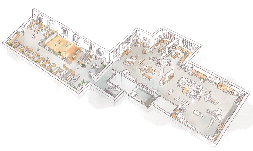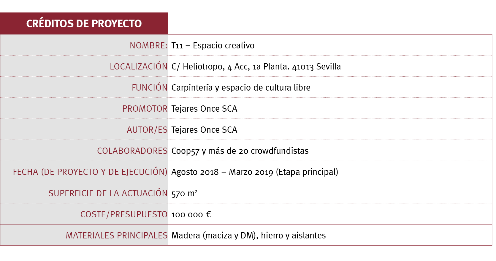 La cooperativa Tejares Once nace en 2013 cuando una serie de carpinteros deciden experimentar con una fórmula cooperativa para la adquisición de maquinaria y espacio de trabajo, facilitando así tener en el espacio propio de trabajo un rango de tecnologías a las que no podrían acceder individualmente y un espacio de trabajo mucho mayor al que en el aspirar. Su implantación fue con el arrendamiento de una nave en un corralón industrial de la calle Tejares, en el barrio de Triana, lo que le dio nombre a la iniciativa (Fig. 2). Pero a final de 2017 se inició el desmantelamiento del corralón, que tras su recalificación en el Plan General de Ordenación Urbana de 2006 podía convertirse en residencial, e iniciamos la búsqueda de un nuevo entorno en la antigua Fábrica de Sombreros de Fernández y Roche. En esta nueva ubicación el proyecto toma el nombre de T11.