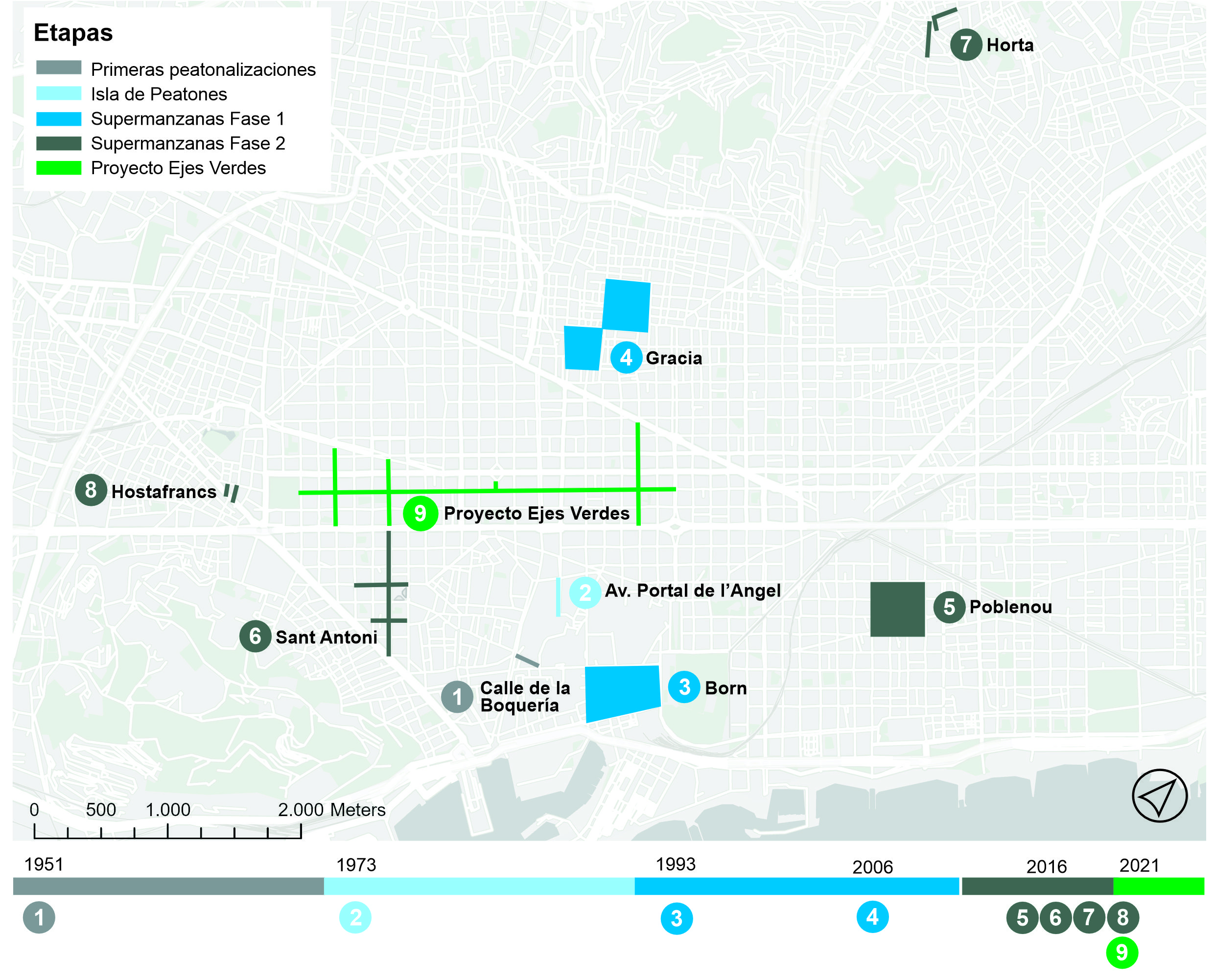 Barcelona tiene una larga tradición en la peatonalización del espacio público (Fig. 1). La primera resistencia vecinal para el reclamo de espacio a los coches se llevó a cabo en 1951 cuando los comerciantes de la calle de La Boqueria en el central barrio Gòtic solicitaron su peatonalización para contrarrestar la saturación vehicular (Santamaría-Hernández, 2017).