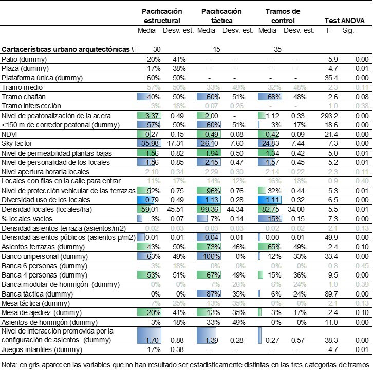 6Identificación de las características demográficas y del uso del espacio público que son distintas en los tres tipos de tramos. Finalmente, se ha realizado un análisis de ANOVA4 para identificar las características demográficas y de uso del espacio público que, de media, son estadísticamente distintas entre los tres tipos de tramo de calle analizados. Esto, con el objeto de aportar una visión comparada de la forma en cómo la pacificación, y más concretamente, el modo que adopta (estructurante o táctica), incide en la cotidianidad de las personas en el espacio público.