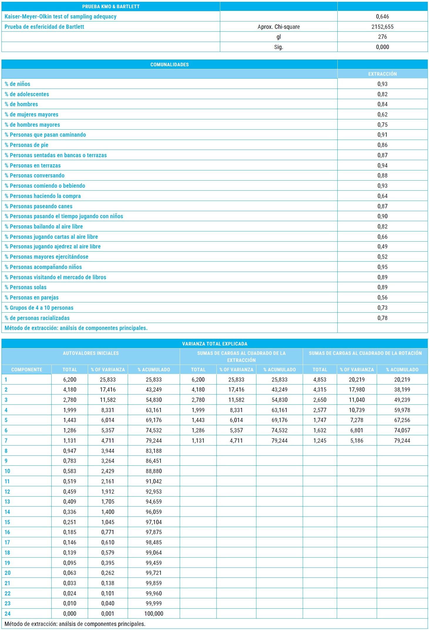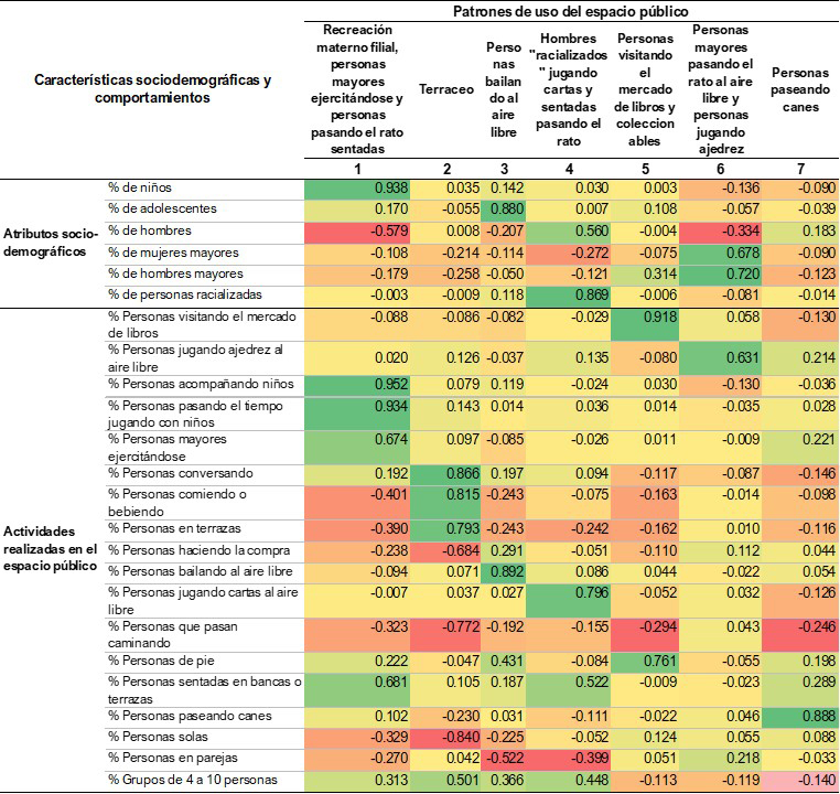 4Identificación de patrones de uso del espacio público. Mediante un ACP se han identificado los referidos patrones. Dicho análisis permite identificar los usos del espacio público que están correlacionados entre sí, es decir, aquéllos que suelen tener lugar en los mismos tramos de calle. Además, cada uno de los componentes principales, es decir, cada patrón de uso del espacio público, es completamente independiente del otro, por ende la correlación entre ellos es nula, lo cual es doblemente ventajoso, puesto que permite identificar con meridiana claridad la intensidad con la que cada patrón ocurre en cada tramo mediante el análisis visual de las cargas factoriales; y por otra, cuando dichas cargas se usan en un procedimiento multivariante, como lo explicamos a continuación, elimina el común problema, en el ámbito urbano, de la multicolinealidad. Para una exposición técnica de este procedimiento consultar Wold et al.,(1987).