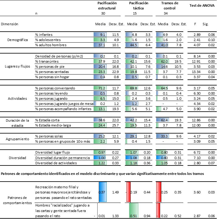 Finalmente, la Fig. 11 ilustra las características medias de la población, las actividades y los patrones de uso del espacio público para cada una de las tres categorías de tramos. Sólo se reportan aquéllas que son estadísticamente diferentes, al menos, al 90% de confianza según la prueba de ANOVA. Así tenemos que: