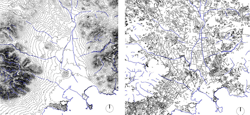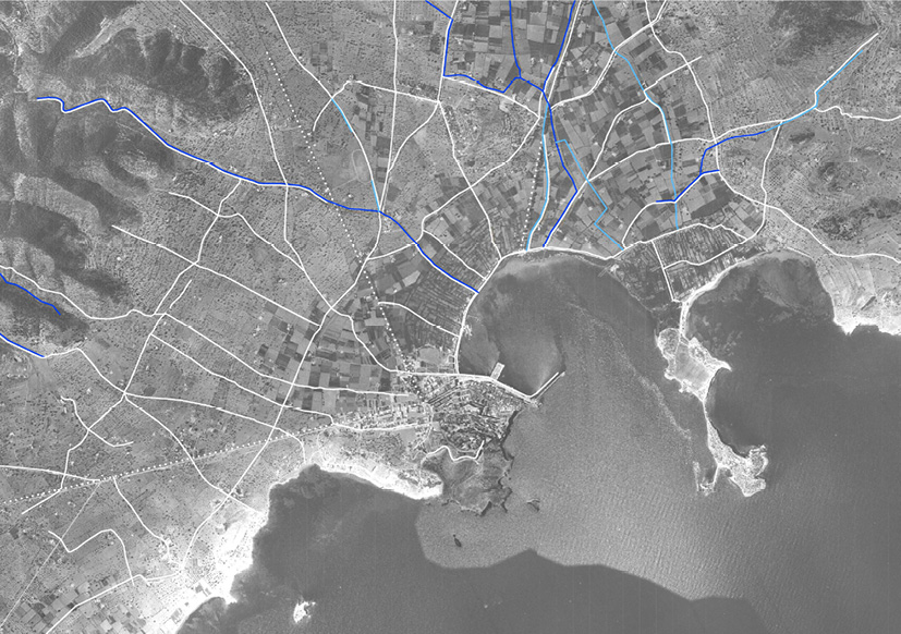 Los torrentes que bajan de las montañas generan una estructura que converge hacia las bahías, subrayando las principales directrices y la forma del espacio de la llanura (Fig. 3). El eje longitudinal del espacio del Pla de Vila, orientado de norte a sur, coincide con el Torrent de Sa Llavanera, cuyos afluentes perpendiculares a la topografía convergen hacia la bahía, definiendo las principales directrices de la percepción del entorno y de la construcción del territorio (Fig .1).