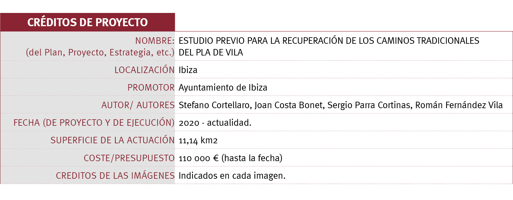 Sin embargo, hoy en día su papel no es solamente histórico. Frente a un paisaje que se nos revela como una sucesión de fragmentos, fruto de actuaciones aisladas vinculadas a los límites municipales, la reidentificación de la red de caminos podría ser la base para un proyecto para el territorio del Pla de Vila (es decir, la llanura que rodea la Ciudad de Ibiza, la Vila, espacio delimitado por las montañas al este y oeste).