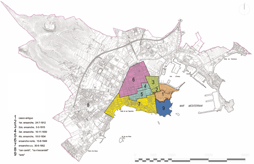 El análisis comparativo de la cartografía histórica, de las fotos aéreas del vuelo de 1956, y las fotos y cartografías actuales, explica claramente el crecimiento de la ciudad de Ibiza a partir del núcleo histórico (Fig. 4). La ambiciosa propuesta urbana marcada por el Paseo de Vara de Rei continúa en los Ensanches (Fig. 2), cuya cuadrícula se desarrolla principalmente a partir de los ejes viarios de comunicación territorial (Sant Antoni y Sant Josep), que se proyectan de forma radial hacia el territorio, siguiendo las principales directrices geográficas e hidrográficas. Esta propuesta, debido a la escasa sección de las calles, genera un espacio urbano muy denso, falto de espacios públicos y de verde, pero permite permeabilidad entre tejido urbano y rural, sin alterar la continuidad entre la ciudad consolidada y el territorio del Pla de Vila.