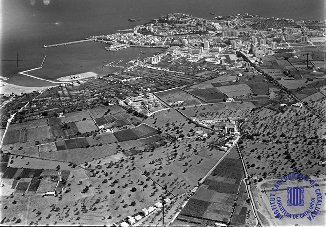 Fig. 5 / Ciudad de Ibiza, foto aérea de 1956 con la superposición de la red de caminos y cursos de agua
