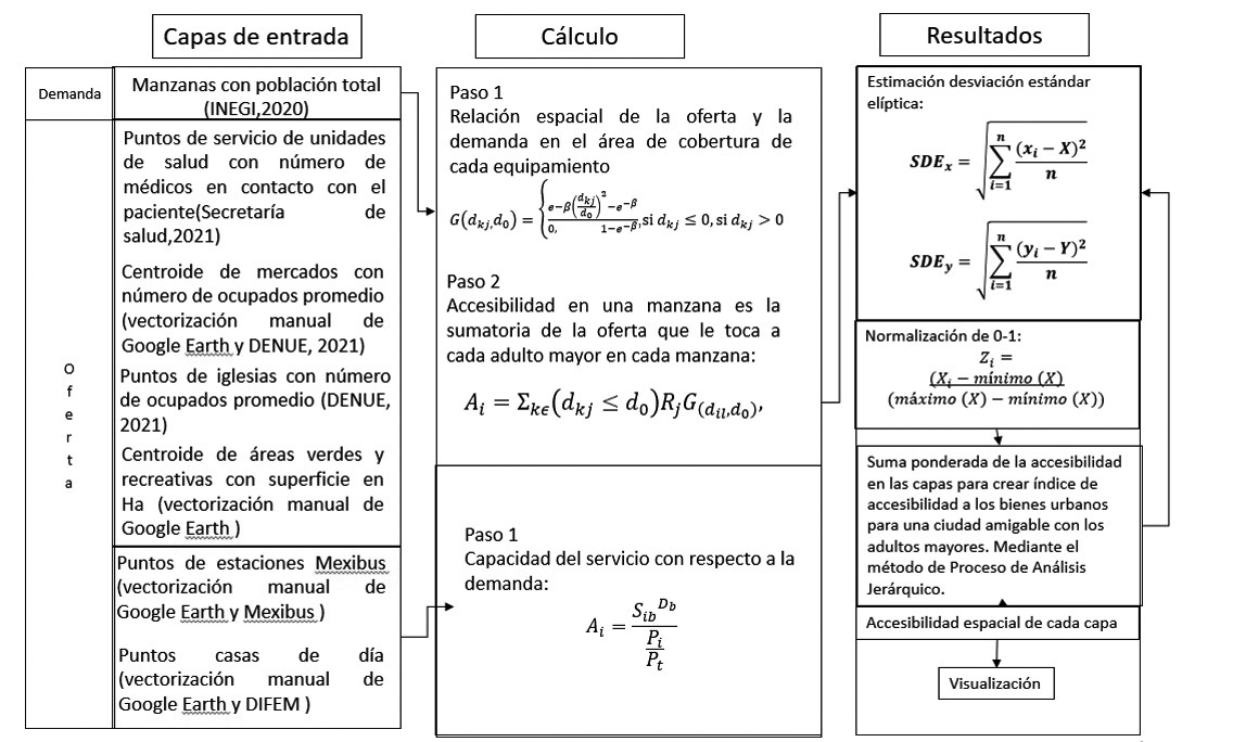 De acuerdo con Chen y Jia (2019), Liu et al. (2022) y Zhang et al. (2019), el método 2SFCA es adecuado para dimensionar la accesibilidad de la población mayor, debido a que contempla las oportunidades de acceso desde una visión acumulativa. En su variación gaussiana el modelo es útil y preciso en los resultados para escalas regionales, al incorporar un peso asociado a la relación de la distancia entre equipamientos (oferta) y usuarios (demanda). Además, permite incorporar umbrales de movilidad para los adultos mayores (Liu et al., 2022; Sansão-Fontes y Espósito- Galarce, 2021; Marín-Cots y Palomares-Pastor, 2020; Pitarch-Garrido y Fajardo-Magraner, 2019; Chen y Jia, 2019; Monsalve et al., 2016).