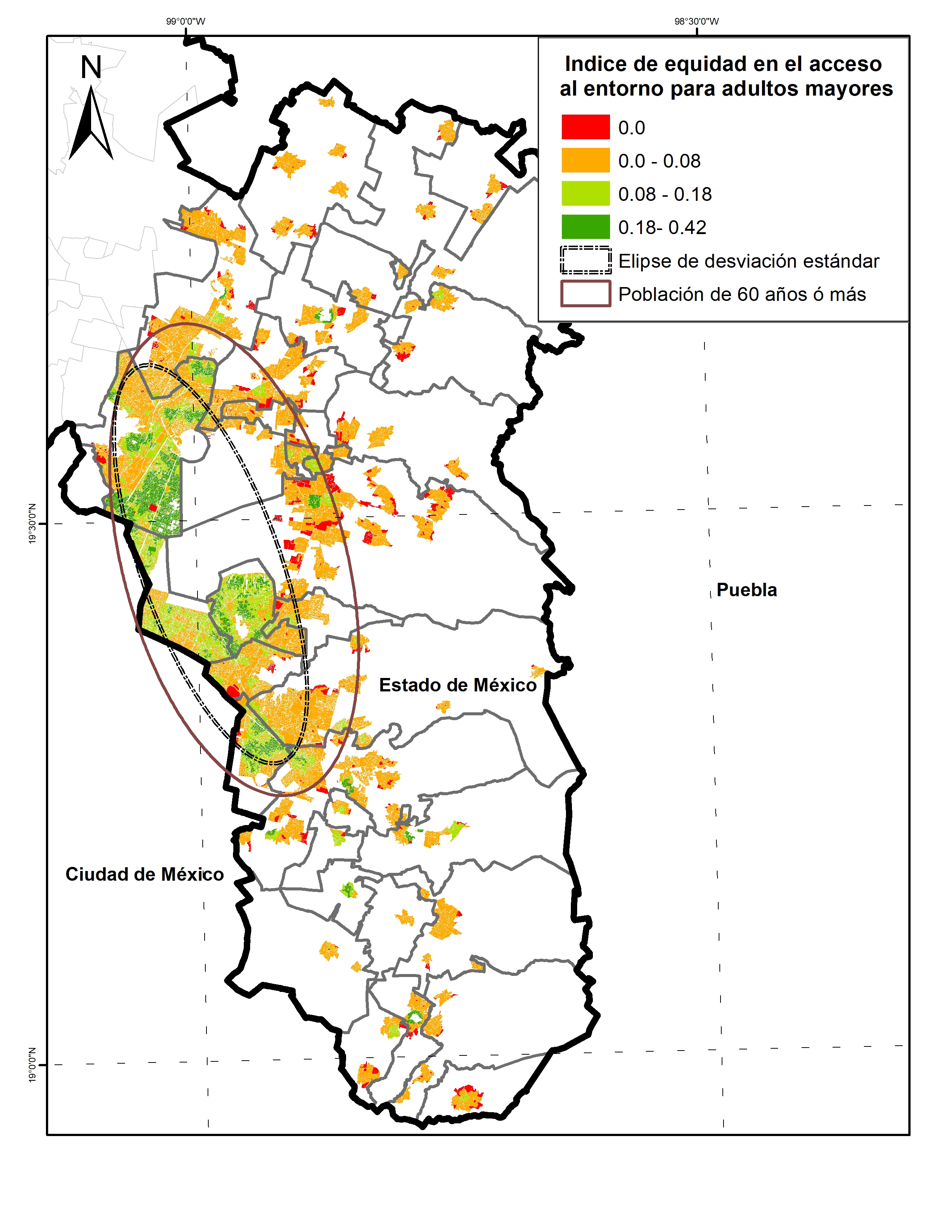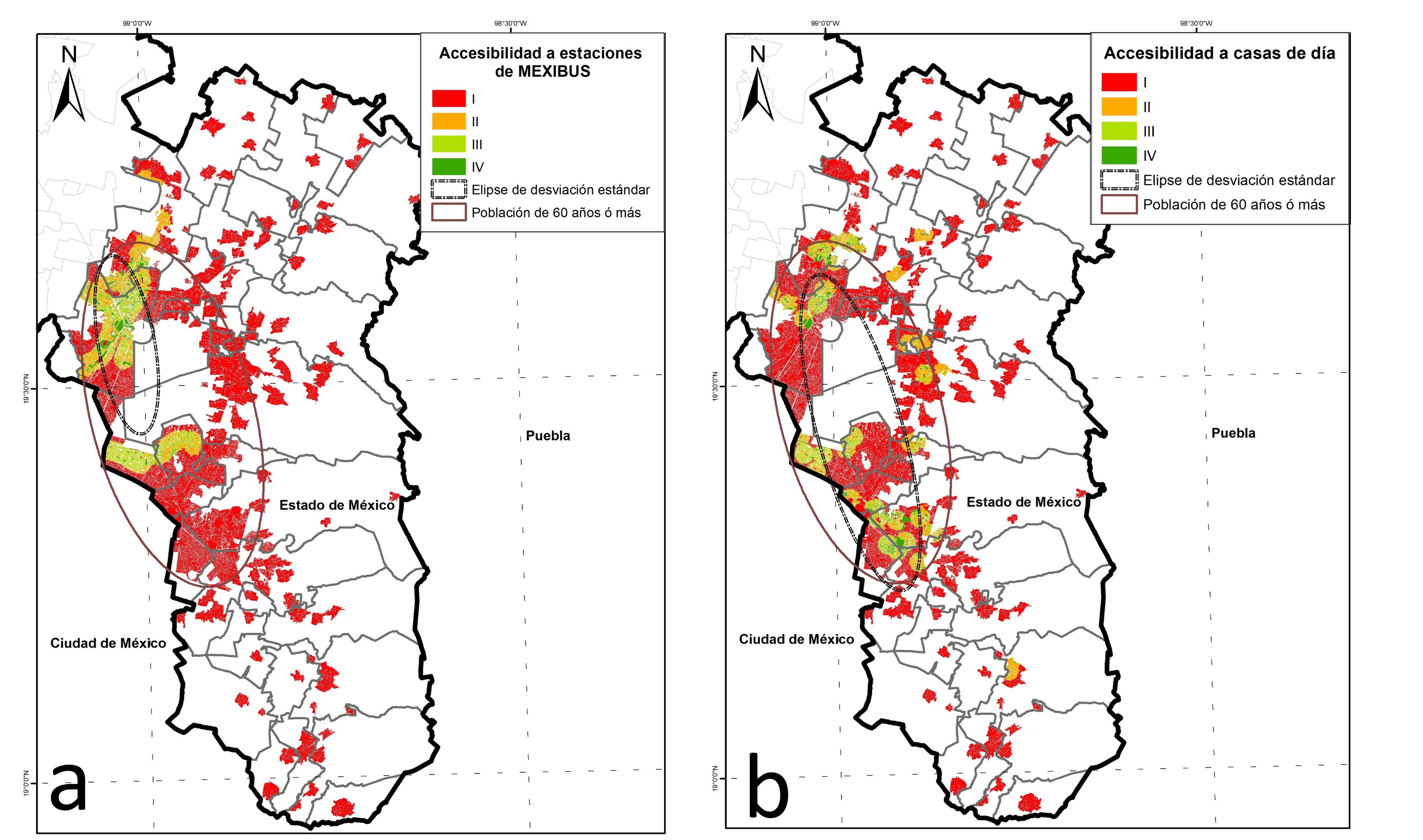 Con la finalidad de identificar las zonas de coincidencia y diferencia entre una alta accesibilidad a los servicios con respecto a la concentración de la población mayor, se estimó la elipse de desviación estándar para identificar la distribución espacial que tiene cada uno de los equipamientos considerados 16.