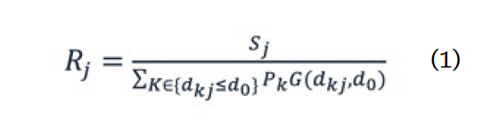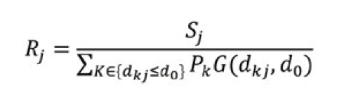 Donde Ai accesibilidad espacial del área i, la suma recorre todas las instalaciones j que están a una distancia dij<=d0 de i, mientras que Rj es la razón de servicio en la instalación j, previamente definida como: