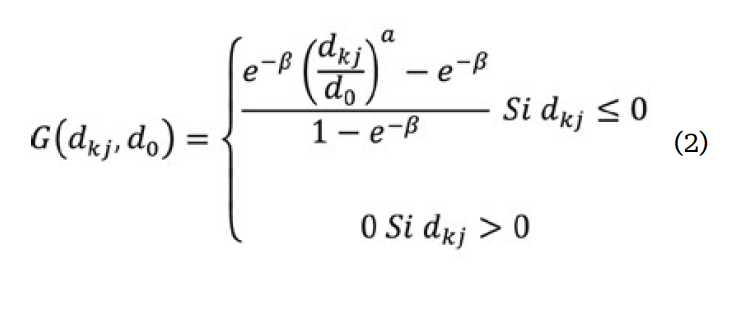 Donde Rj es el índice de accesibilidad o disponibilidad en la instalación j, Sj es la capacidad del servicio en j, Pk es la población k dentro del área de servicio d0, dkj es la distancia entre la población k y los equipamientos correspondientes j. Por su parte G corresponde al peso de Gauss correspondiente a la impedancia, determinada por Ec.2: