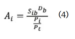 De forma que, Ai representa la accesibilidad de la manzana i, Sib es la distancia D entre el centroide de la manzana i y el punto b de servicio más cercano, elevado al peso correspondiente con respecto a la ubicación que tiene en el umbral de distancia que va de 1 a 0, donde 1 es muy accesible y 0 poco o nada accesible (500 m=1, 501-900 m=0,5, 901-1400 m=0,25, >1401 m=0) 14, todo esto dividido entre la razón de la población en la manzana Pi, entre la población total Pt lo que normaliza la accesibilidad según la densidad poblacional.