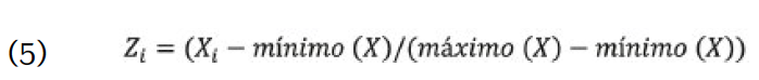 Una vez calculada la accesibilidad en cada manzana, los resultados del nivel de acceso por tipo de equipamiento se normalizaron entre 0 y 1 aplicando la siguiente operación ver Ec.5: