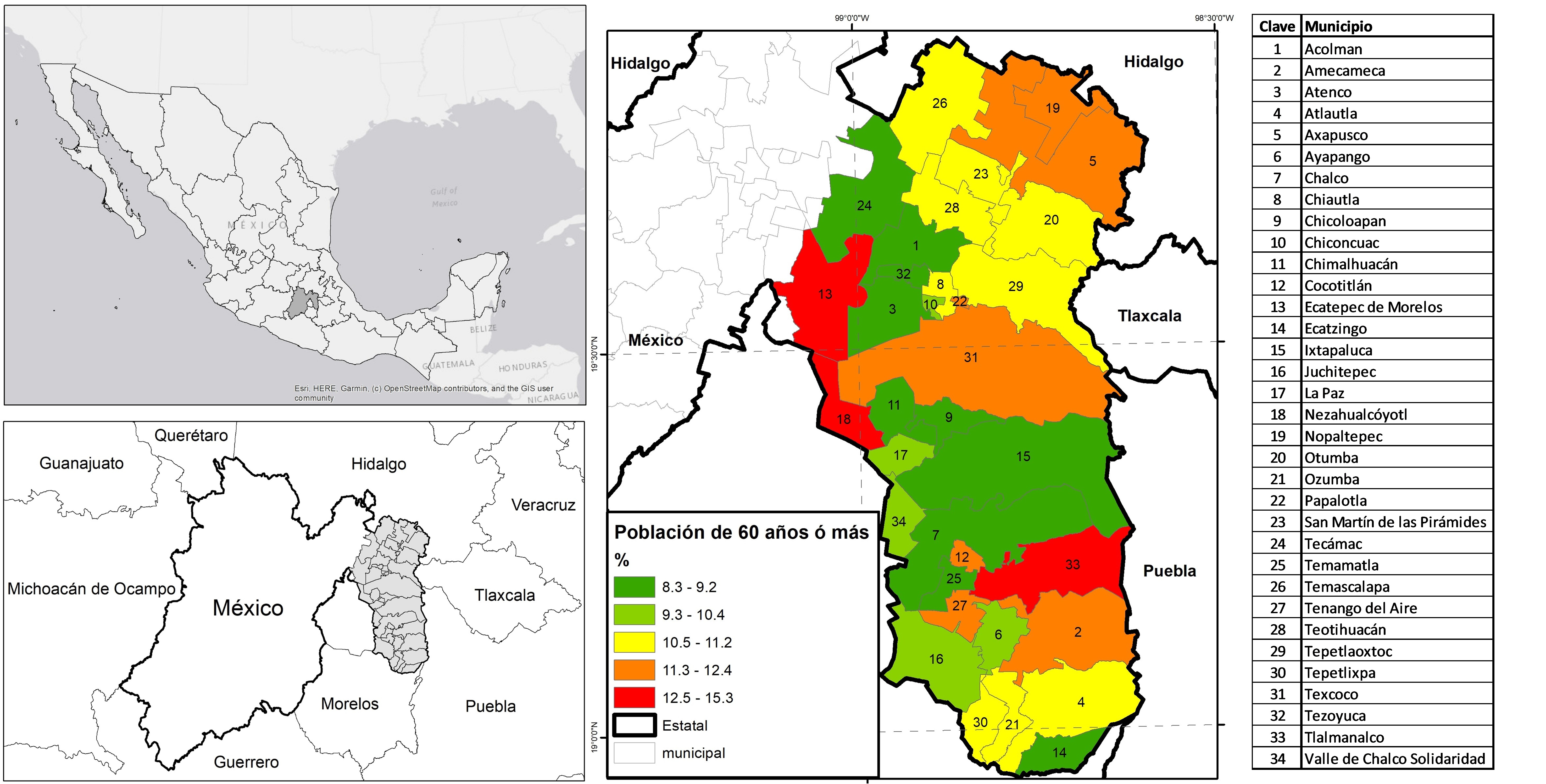 La población mexicana está inmersa en un proceso de envejecimiento espacialmente concentrado en las ciudades y en algunos territorios intraurbanos (Álvarez-Lobato et al., 2018; Garrocho y Campos, 2016). Actualmente, el 50,7% de la población de 60 años o más vive en localidades de más de 100 000 habitantes y otro 13,8% en localidades de entre 15 000 y 100 000 habitantes (INEGI, 2020).