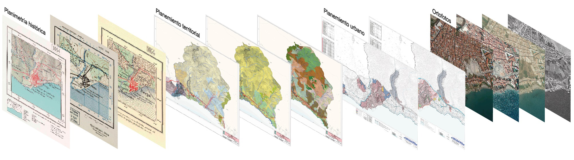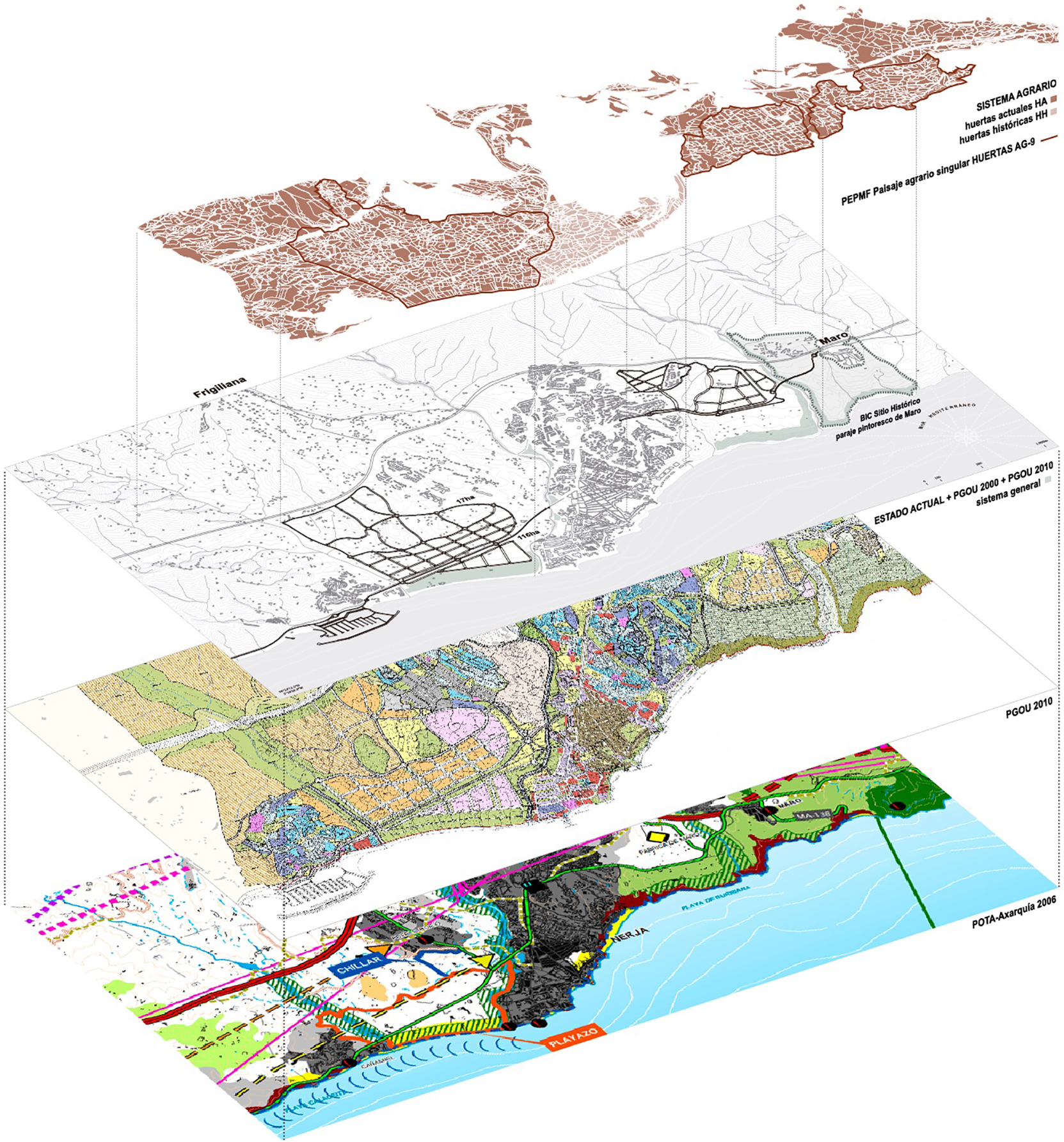 Finalmente, la delimitación del área de acción a la escala territorial, siguiendo el criterio de situar a la huerta en el centro de la investigación, es la equivalente a la presencia histórica de la misma y su huella o permanencia actual que se enmarca dentro del término municipal, superado al norte para establecer su relación con Frigiliana y recogiendo por tanto todas las unidades mencionadas anteriormente. Todo este proceso se ha desarrollado en un entorno de Sistema de Información Geográfica (SIG) que permite el registro y gestión de multitud de datos, ya localizados en documentos consultados y aquellos generados durante la propia investigación, y la observación de las relaciones y correspondencias entre los diferentes elementos que más allá de la identificación de piezas puntuales permiten entender el territorio como un sistema complejo. Es en este punto donde entra la fase de análisis. La lectura por capas permite la observación de los distintos marcos de forma física y temporal superponiendo los marcos normativos de los distintos instrumentos tanto de ordenación urbanística y territorial para encontrar convergencias y divergencias.