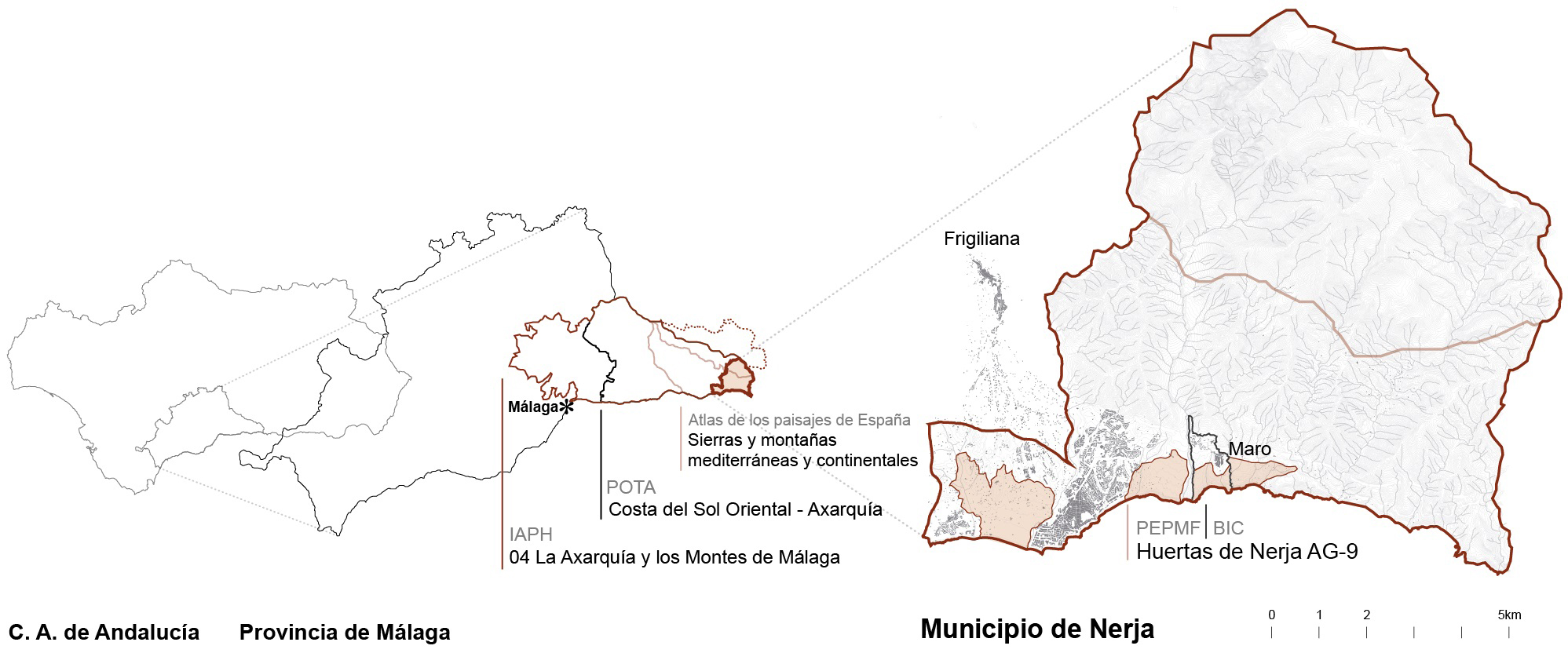 El marco de acción general es la comarca de la Axarquía, un espacio geográfico muy concreto delimitado por las sierras de Alhama, Tejeda y Almijara al Norte y al Este, los Montes y Hoya de Málaga al Oeste y el Mediterráneo al Sur. Son los límites establecidos por estos elementos geográficos, siendo los principales la topografía y la hidrografía, los que permiten el primer acercamiento escalar. Se identifican y señalan los perímetros que reconocen los distintos marcos normativos y documentos de información siendo estos ordenados por superficie: la Axarquía y los Montes de Málaga por parte del R-PICA realizado desde el IAPH (2016), Costa del Sol Oriental-Axarquía del POTA y Sierras y montañas mediterráneas y continentales del Atlas de los paisajes de España. Dentro del límite municipal se superponen dichas identificaciones de unidades territoriales y se incluye la figura de espacio protegido que define el PEPMF-Málaga de la Huerta de Nerja AG-9 como Paisaje Agrario Singular (Fig. 3).