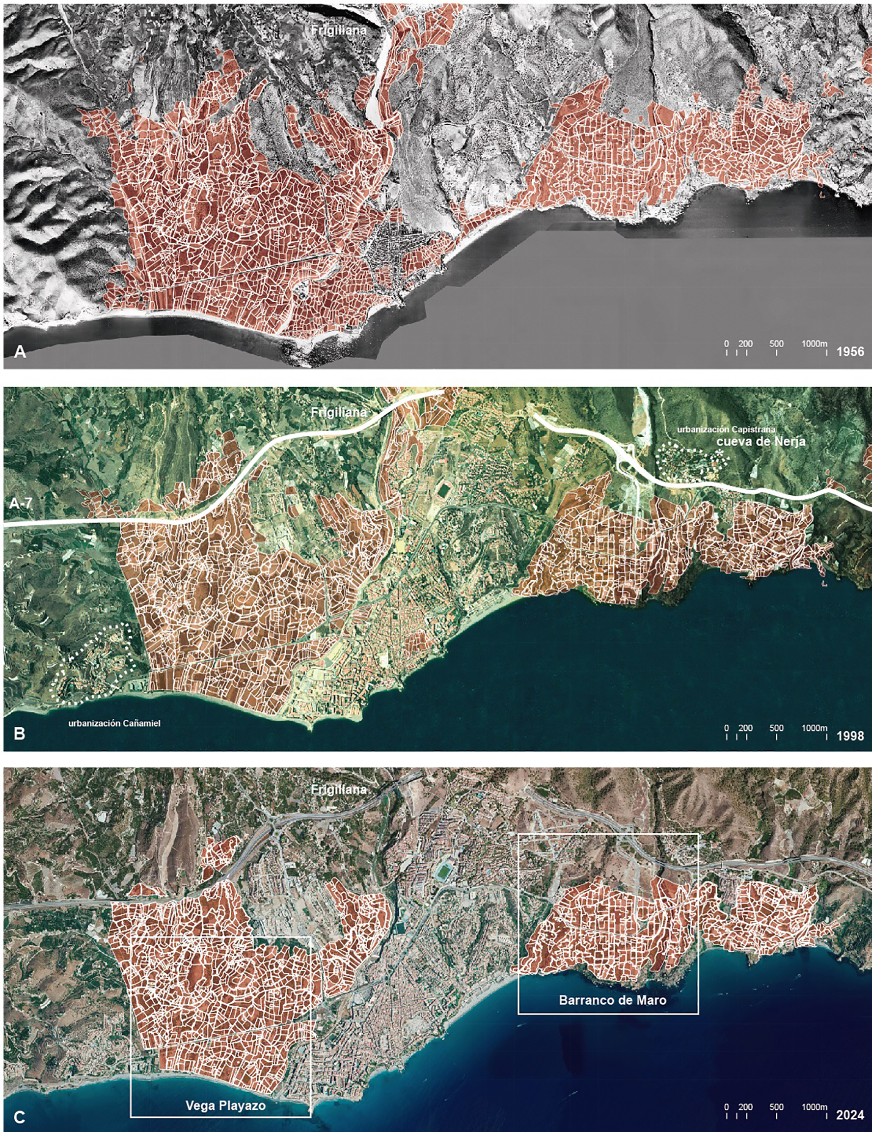 Si se avanza en el tiempo hasta el desarrollismo de la década de 1980 se comprueba cómo el área que comprendía el inicial caserío hasta el trazado del río Chíllar queda rápidamente ocupado. El avance urbano de la zona noreste sigue unas pautas similares. Las huertas limítrofes a la costa pasan a convertirse en edificaciones de ocio que equipan a la ocupación inmediatamente superior de viviendas de veraneo formando el frente que a día de hoy caracteriza a la playa de Burriana. En paralelo, alejado del núcleo urbano inicial de Nerja, se suceden al oeste las primeras edificaciones de lo que será la urbanización Cañamiel ocupando un promontorio límite del sistema agrario de las huertas en contacto con el litoral de la vega Playazo. Esta actuación sustituye un pequeño grupo de huertas bajo la N-340 (Fig. 5b) que poco después supone el fin de las huertas que quedan a ese lado del arroyo del Meli, camino del Río Seco (Fig. 5c). De igual manera al noroeste se ha sucedido la ocupación de urbanizaciones que se incorporan al incipiente trazado de la carretera A-7. Al este en proximidad al noroeste de Maro sobre la A-7, sumado a otro nuevo trazado de nudo urbano que interrumpe la trama de huerta próximas al barranco de Maro, se sucede una situación similar con la urbanización El Capistrano sobre el promontorio norte de Maro donde se sitúa la Cueva de Nerja (Fig. 5b).