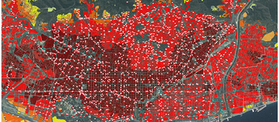 Fig. 8 / Mapa del Índice de Accesibilidad al Transporte Público y resultados de cobertura por poblacional y superficie. Ámbito ciudad de Barcelona.