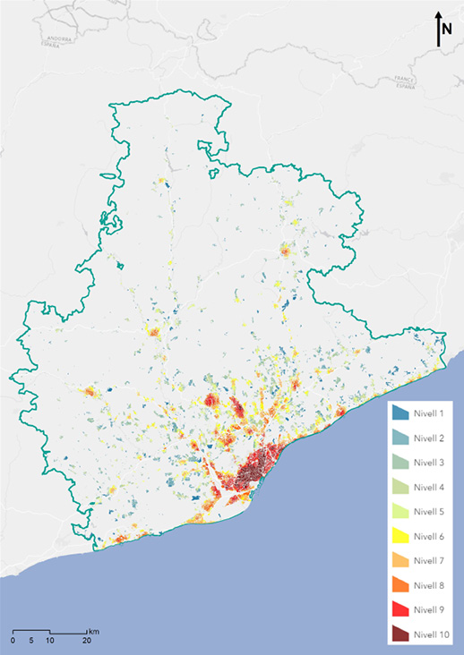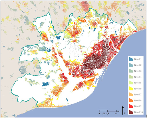 Por ello, todos los niveles con un grado de accesibilidad bueno (7), muy bueno (8), excelente (9) y excelente plus (10) son áreas densamente pobladas tanto de la ciudad de Barcelona como de su continuo urbano próximo, así como el resto de las ciudades maduras de la región metropolitana.