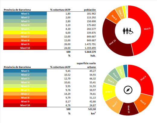 Fig. 6 / Mapa del Índice de Accesibilidad al Transporte Público y resultados de cobertura por población y superficie. Ámbito provincia de Barcelona.