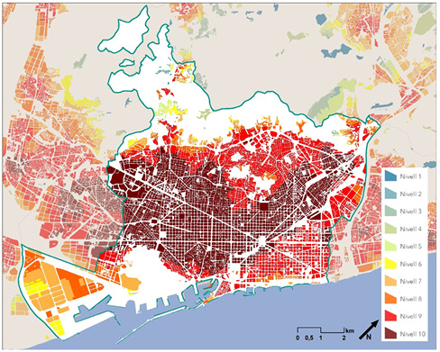 Nivel 10: zonas con una accesibilidad al transporte público colectivo excelente plus. Se corresponden a zonas urbanas muy densas, servidas como mínimo por dos tipos de transporte ferroviario (combinación de Metro, FGC, RENFE y/o Tranvía) con frecuencias muy elevadas (similares a las del Metro) y una red densa de autobús urbano, autobús metropolitano (autobuses AMB) e interurbano a menos de 1300 metros o un máximo de 20 minutos a pie. Prácticamente, coinciden con las zonas urbanas compactas de muy alta densidad concentradas en la comarca del Barcelonés (Fig. 5f).