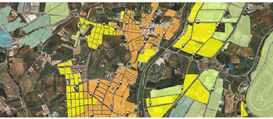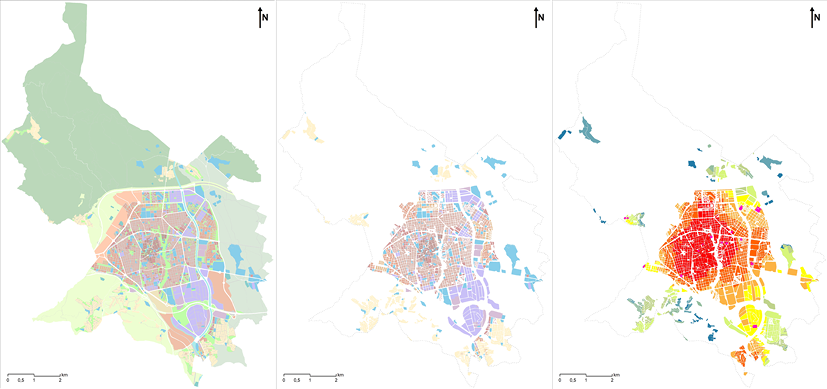 Tal y como se observa en la Fig. 2, observamos el estado actual del planeamiento urbanístico a partir de las calificaciones del suelo usando las claves de leyenda del Mapa Urbanístico de Catalunya. La imagen del centro muestra sólo los bloques que forman parte intrínseca del proyecto: el suelo urbano residencial (pudiéndose diferenciar el núcleo antiguo, el urbano tradicional, la ordenación cerrada, la ordenación abierta, casas agrupadas y casas aisladas según códigos estandarizados del mismo Mapa Urbanístico de Catalunya), el suelo urbano de actividad (pudiéndose diferenciar el suelo de actividad económica industrial, de servicios y logístico), los suelos mixtos y los suelos cualificados como de equipamientos municipales. La imagen de la derecha muestra la misma información, pero una vez se ha calculado el Índice de Accesibilidad al Transporte Público mostrándose aquí el planeamiento urbanístico en función del grado de accesibilidad o atracción al uso del transporte público colectivo en todos sus modos (viario, en el caso de los autobuses tanto urbanos como interurbanos y ferroviario, incluyendo metros, tranvías y los distintos operadores de ferrocarril).