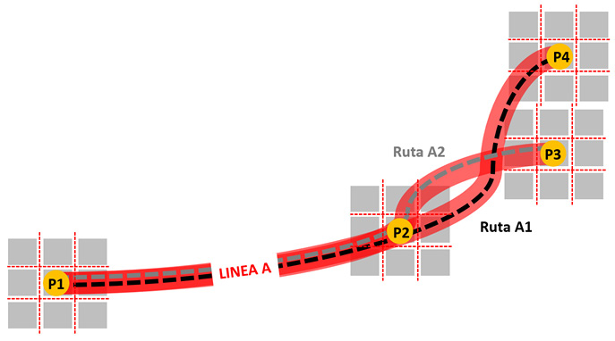 Fig. 1 / Ejemplo conceptual de paradas, línea y rutas. Interacción sobre planeamiento urbanístico y callejero