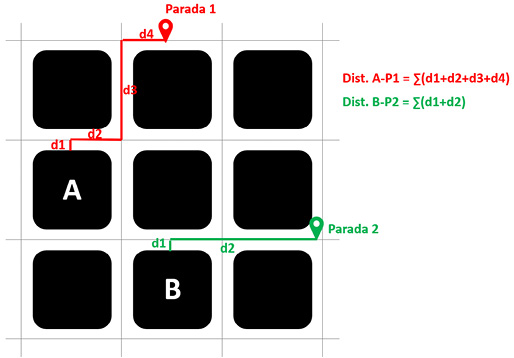 La distancia del bloque ‘A’ a la parada ‘1’ será la suma de la longitud de todos los tramos de color rojo. La distancia del bloque ‘B’ a la parada ‘2’ será la suma de la longitud de todos los tramos de color verde. A fin de limitar la cantidad de distancias calculadas de bloques a paradas, se fijan tres escenarios distintos de cálculo de las distancias: a pie, en bicicleta y en vehículo privado. A pie, la suma de las distancias de bloque a parada no podrá superar los 1300 metros. A partir de esa distancia, cualquier parada deja de tener atracción hacia un bloque. La distancia del punto de inicio del bloque al eje de calle se fija a partir de un radio de 30 metros de máximo de tolerancia. Además, se fija un máximo de 3000 pares de origen/distancia con el fin de incluir el máximo de conectores a paradas. Aplicando la misma metodología, en el caso de la bicicleta, la distancia se fija en 2500 metros y, en el caso del vehículo privado, se determina un tiempo máximo de 20 minutos y, siempre y cuando, la parada destino disponga de una zona específica de aparcamiento de intercambio modal. Todos los cálculos toman como referencia de base el planeamiento urbanístico vigente a partir de la extracción de la capa de suelo urbano consolidado residencial del Mapa Urbanístico de Catalunya con clave sintética “residencial”, “mixto”, de “actividad económica” y de “equipamiento” en suelo urbano consolidado y en suelo urbano no consolidado. No forma parte de este estudio ni el suelo no urbanizable, ni el suelo urbanizable (delimitado y no delimitado) en tanto que se trata de espacios sin una dotación completa de infraestructuras para la movilidad. Obviamente, cabe señalar que zonas densamente urbanizadas y con una buena dotación de transporte público, formadas mayoritariamente por bloques de suelo urbano residencial, mixto, de equipamientos o de actividad económica podrán disponer de más de una parada de transporte público mientras que zonas poco urbanizadas y, sobre todo, con una baja disponibilidad de paradas de transporte público tendrán un valor total de distancias mucho menor.