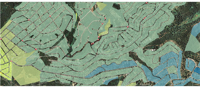• Callejero (eje de calles): obtenido a partir de la Base Topográfica de Catalunya a escala 1:25 000 (BT-25M) permite disponer de la base de datos vectorial de los ejes de calles y de las infraestructuras viarias necesarias para poder modelar y automatizar el cálculo de las distancias entre todos los bloques del planeamiento urbanístico y el conjunto de paradas de transporte público en tanto que toda vía de comunicación está destinada a la circulación de vehículos automóviles o de personas. Véase con más detalle el papel del callejero en la Fig. 3.