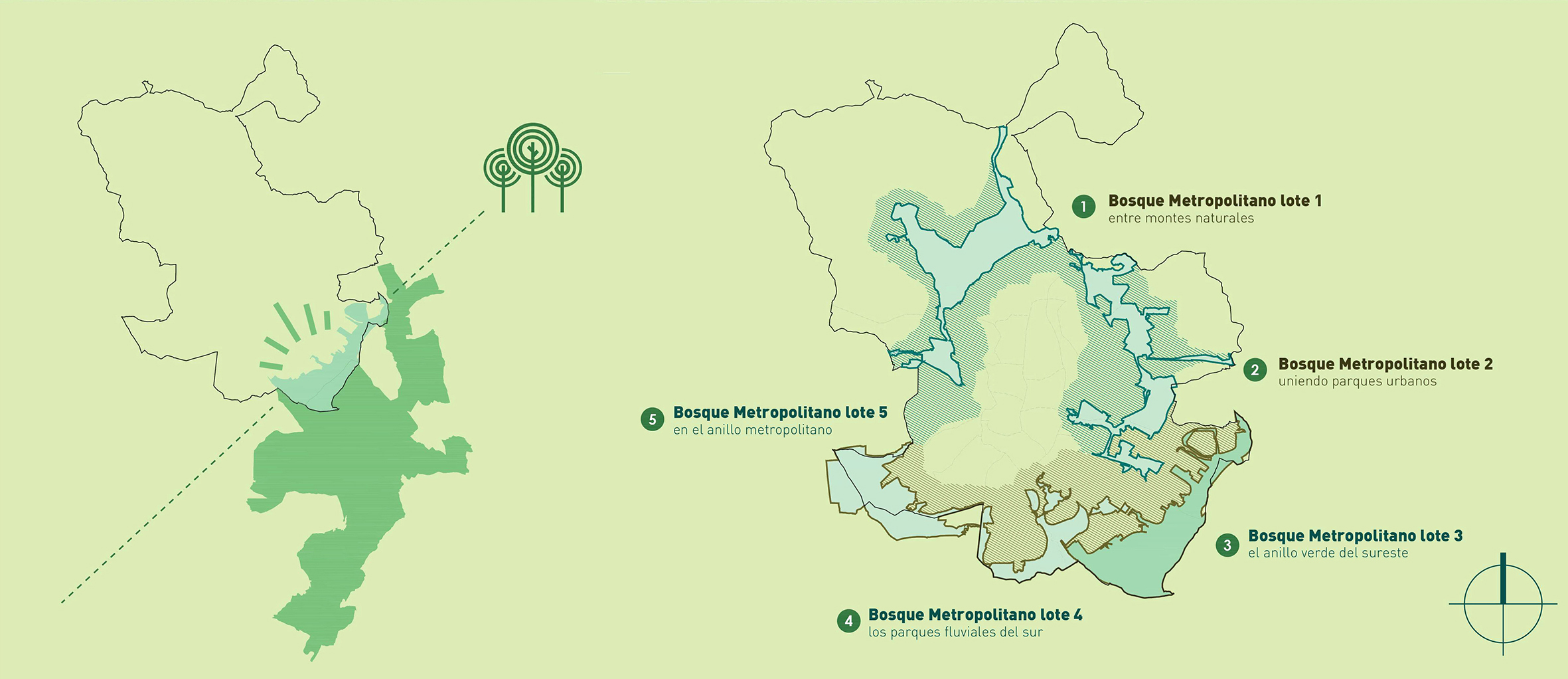 En el año 2020, el Ayuntamiento de Madrid convoca el concurso del Bosque Metropolitano de Madrid, una ambiciosa propuesta para la planificación y desarrollo de una infraestructura verde en anillo, divido en 5 sectores. En este artículo se presenta el proyecto desarrollado del sector 3, denominado “el anillo verde del sureste”, un paisaje periurbano árido, que se caracteriza por su enorme fragmentación, seccionado por grandes infraestructuras, como un archipiélago de islas de suburbanización residencial, por la presencia de actividades vinculadas a la gestión de residuos dependientes del conjunto metropolitano, y por su grave degradación, con situaciones de marginalidad y grandes áreas cubiertas por vertidos de residuos irregulares, en colisión con ecosistemas valiosos y frágiles, en relación con el Parque Regional del Sureste (Fig. 1).