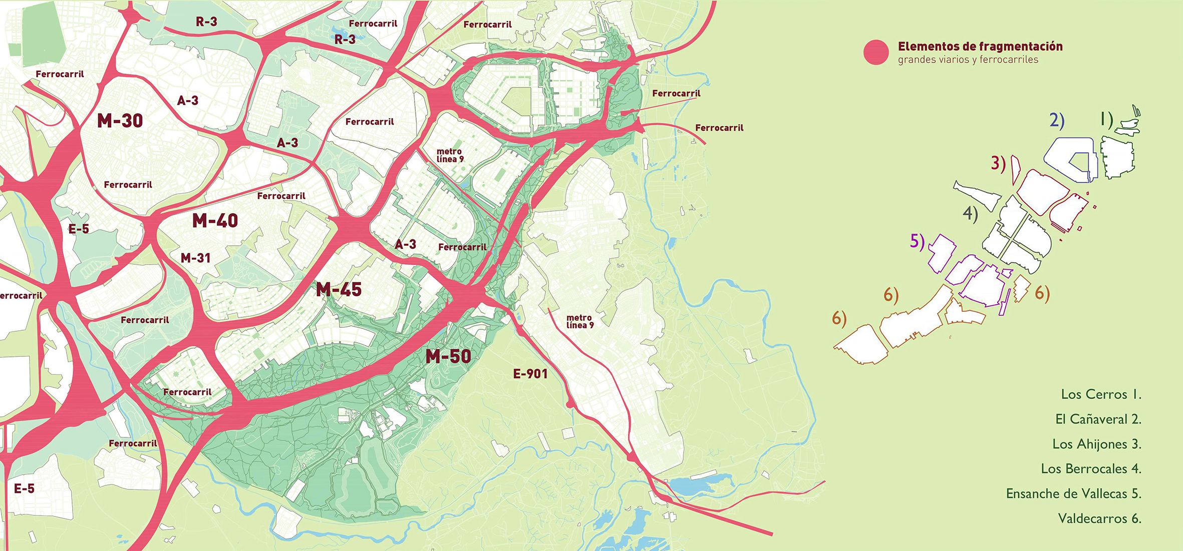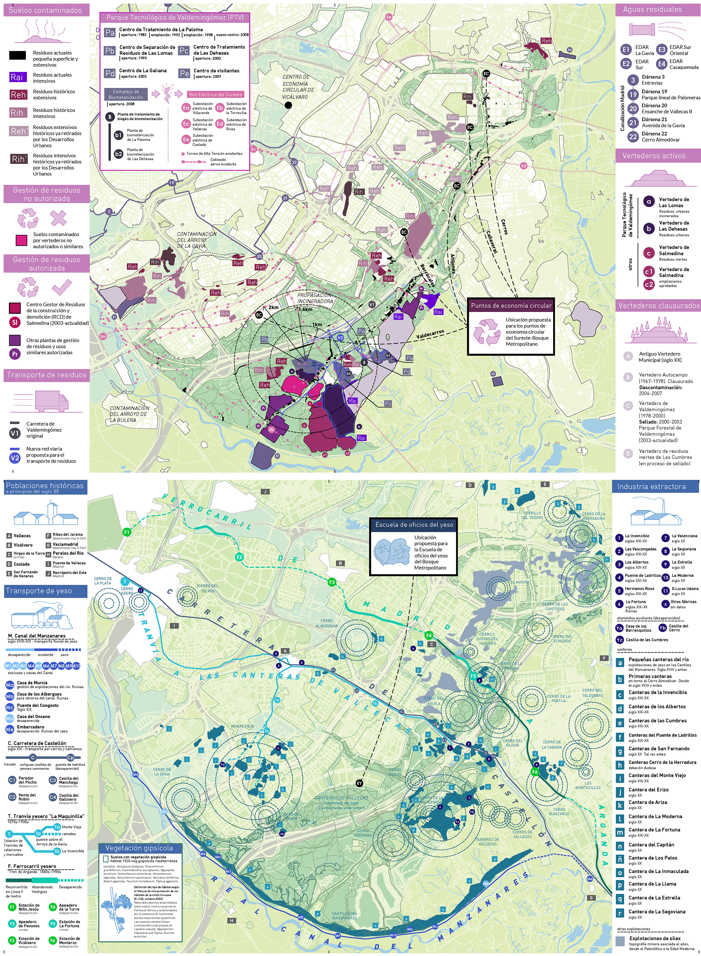 El sureste da respuesta a la necesidad de crecimiento de la ciudad, a través de grandes ensanches residenciales que albergarán miles de viviendas situadas entre el paisaje de la ciudad consolidada y paisaje operativo. Un territorio que históricamente ha servido a los crecimientos urbanos y ha sido especialmente receptor de impactos ambientales, que afectan directamente a sus habitantes. La corona sureste madrileña es clave para el funcionamiento de la ciudad: en ella se encuentran las grandes infraestructuras de gestión de Residuos Sólidos Urbanos (RSU), residuos inertes, residuos peligrosos, con sus correspondientes vertederos e incineradora, así como las Estaciones Depuradoras de Aguas Residuales (EDAR). Adicionalmente, se superpone transversalmente la grave problemática de los vertidos irregulares, que degradan enormes extensiones (Fig. 4).