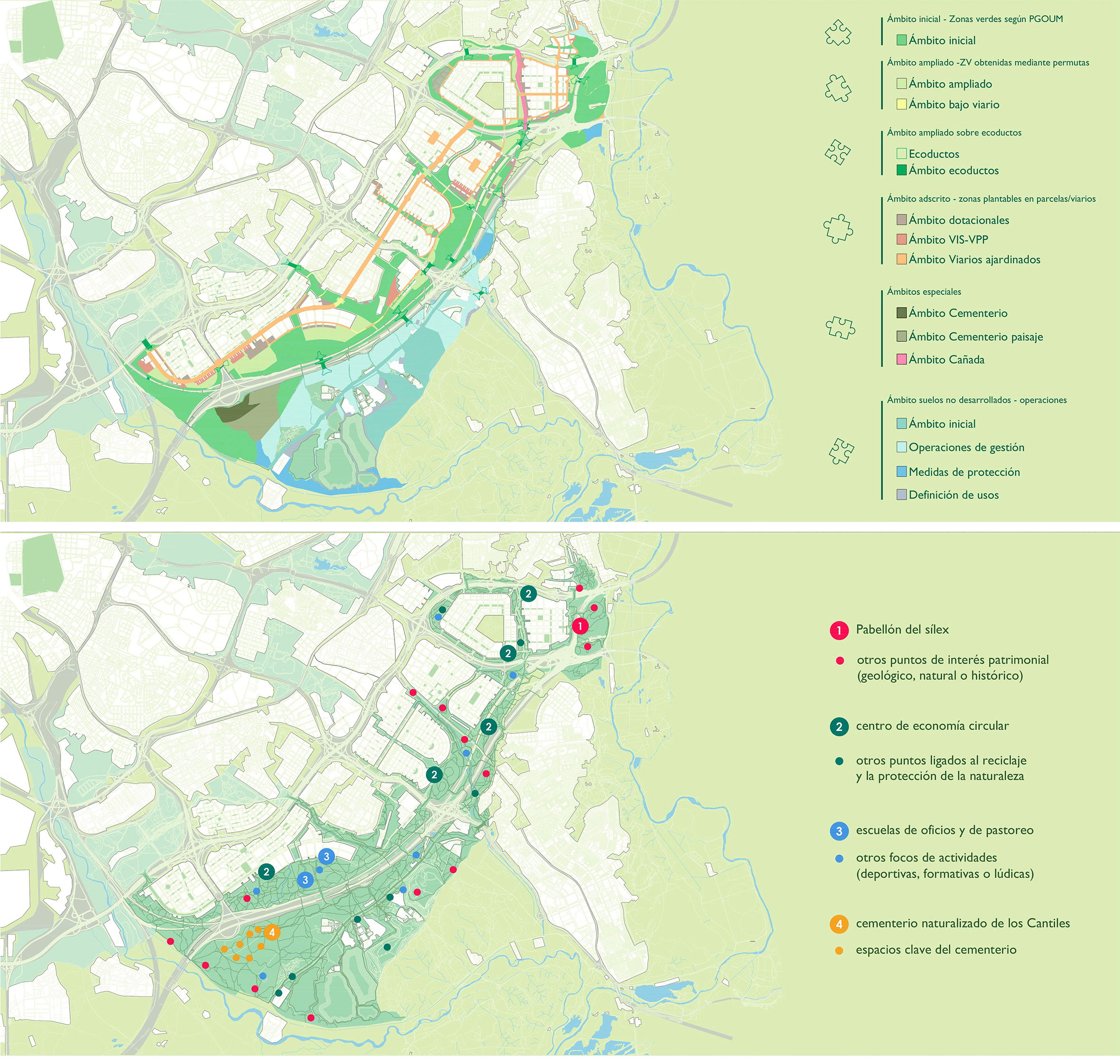 El proyecto se apoya en la puesta en valor de la memoria del lugar, su patrimonio productivo, sus vestigios arqueológicos, sus paisajes funerarios, sus vías pecuarias o la tradición agrícola, pero también en la generación de una nueva identidad para los nuevos y futuros residentes, así como una reconceptualización de los espacios servidores.