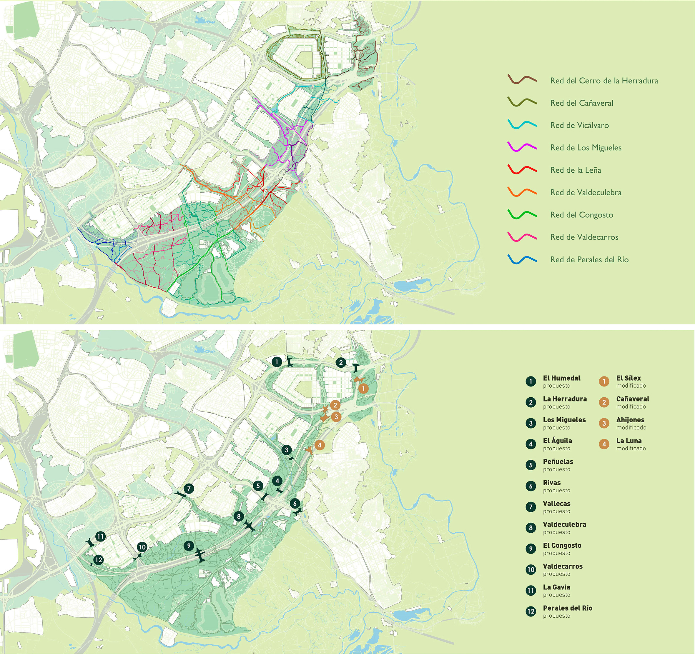 La infraestructura se presenta como la última posibilidad de consolidar un anillo para la ciudad de Madrid, al encontrarse ya su crecimiento con los límites del término municipal. No obstante, para el logro de una transformación sistémica que trascienda los límites de la actuación, son claves otras estrategias complementarias. Por un lado, en los desarrollos: la penetración radial en el tejido consolidado mediante corredores verdes urbanos, la permeabilidad de las vías de borde de los nuevos desarrollos y la reducción y porosidad de las superficies urbanizadas pavimentadas. Por otro lado, en las zonas verdes se propone la conexión ecológica de los fragmentos mediante ecoconectores, la consideración de la red hídrica de microcuencas de escorrentía, la recuperación de la red histórica de caminos en continuidad, la colonización con especies vegetales adaptadas y nuevas actividades vinculadas a la memoria del lugar (Fig. 2).