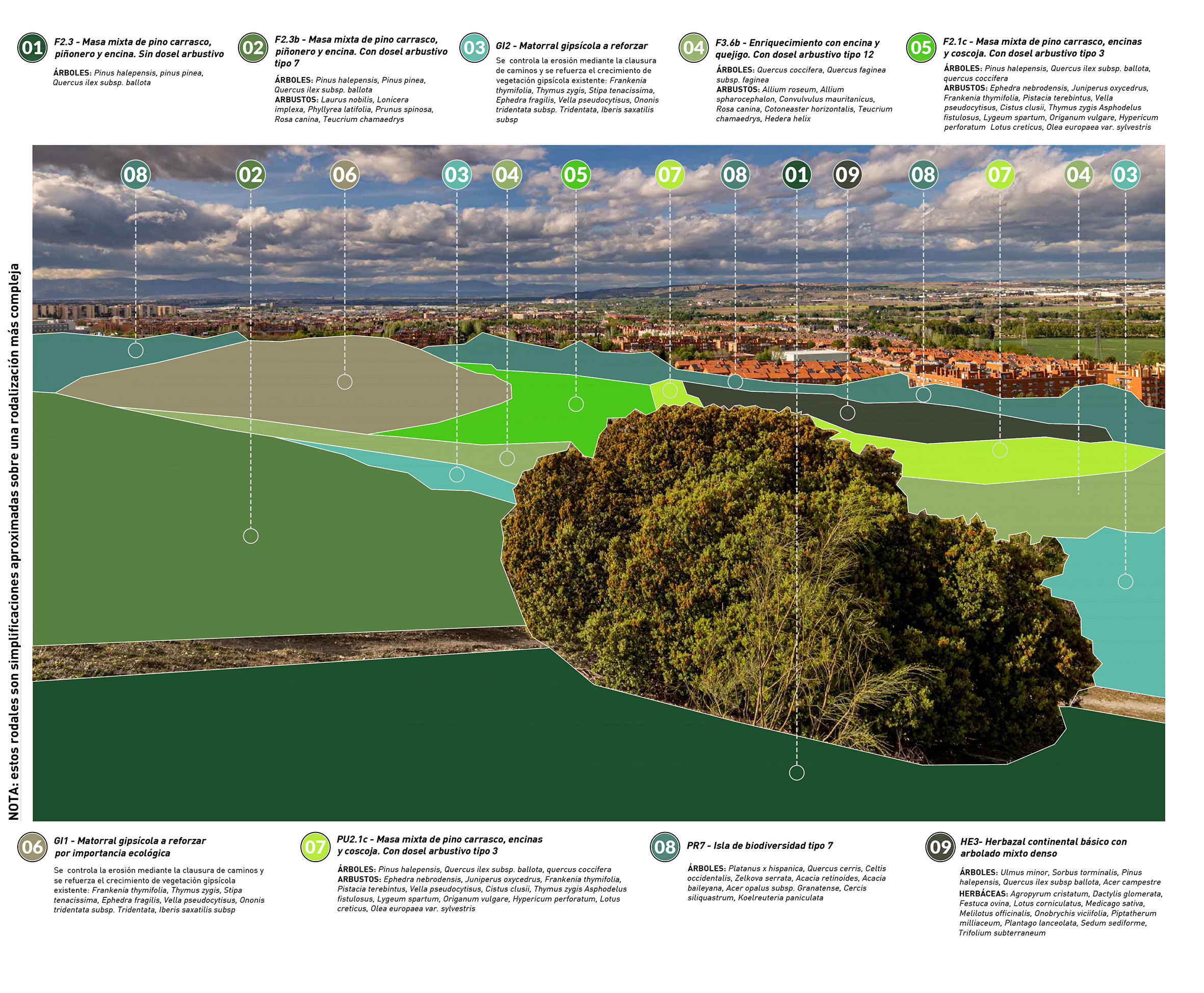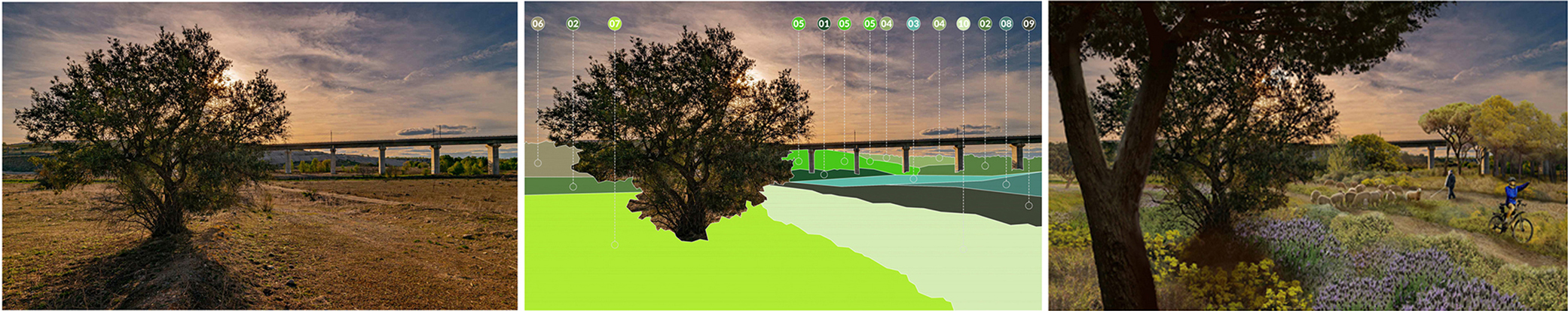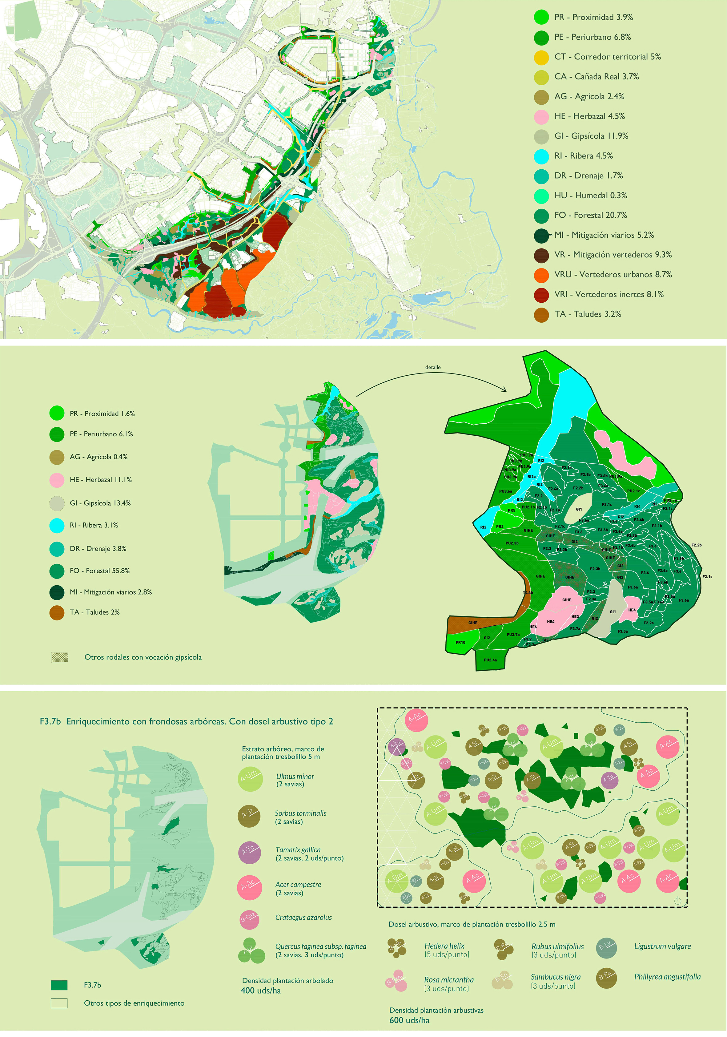La propuesta para la regeneración paisajística y la reterritorialización del sureste madrileño integra estrategias ambientales, sociales y culturales. Se apoya en la puesta en valor de aspectos como la memoria del lugar, su patrimonio productivo, sus vestigios arqueológicos, sus paisajes funerarios, sus vías pecuarias y su tradición agrícola. Pero también propone la generación de actividades pertinentes y paisajes valorizados, que conformen una nueva identidad para los residentes recién llegados. Se trata de una reconceptualización de los espacios marginales, espacios olvidados o espacios servidores, otorgándoles nueva funcionalidad y significado, como es el caso de la iniciativa de un cementerio naturalizado que pone en valor el paisaje original, próximo a los Cantiles del Manzanares.