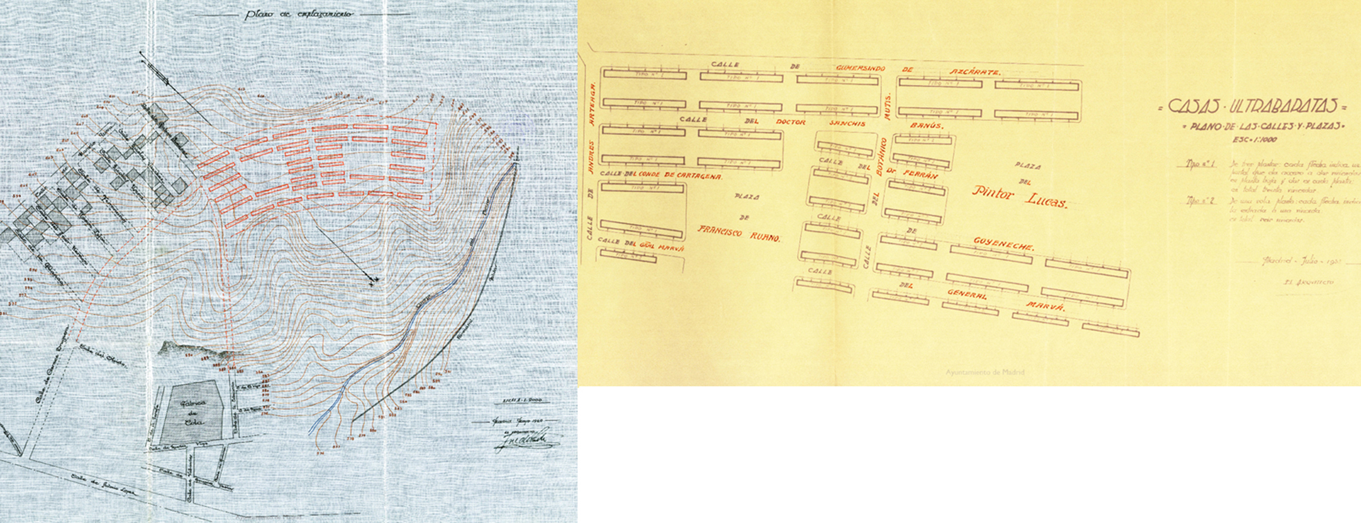 FIG. 3. Comparación entre Proyecto de construcción de la colonia de Casas Baratas “Salva y Ahorro” de 1929, imagen de la izquierda (Biblioteca digital memoriademadrid, 1929), y el plano de las calles y plazas de las Casas Ultrabaratas de 1932 Fuente: Biblioteca digital memoriademadrid, 1932a