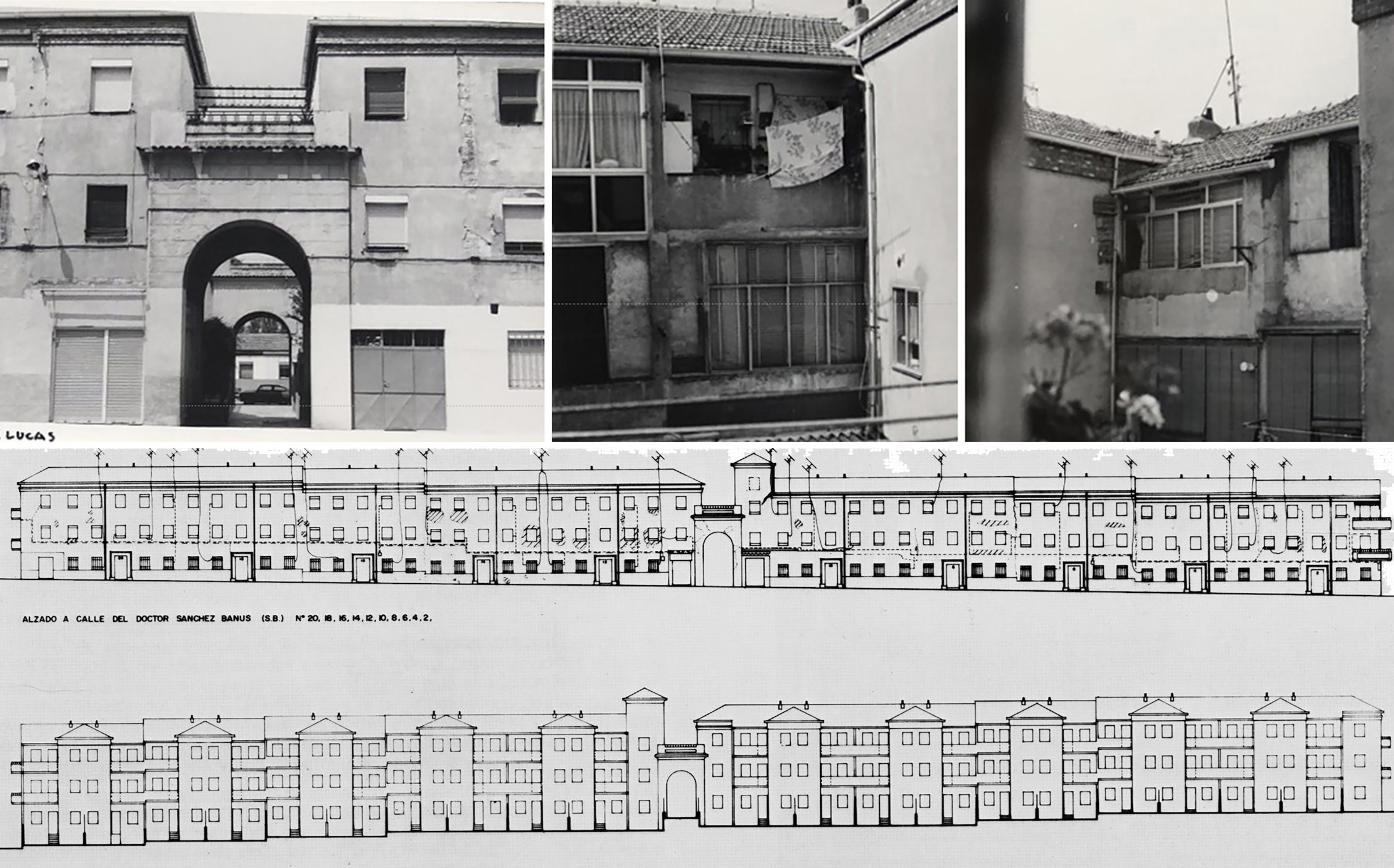 FIG. 7. Izq. 1975, fachadas de la calle Pintor Lucas antes de la rehabilitación. Centro y drcha., 1975, fotografías de la ocupación de las zonas aterrazadas modificadas. Abajo, planimetría realizada por el estudio Alas y Casariego para el proyecto de ejecución y rehabilitación básica de la Colonia Municipal Salud y Ahorro. [Colonia Moscardó]