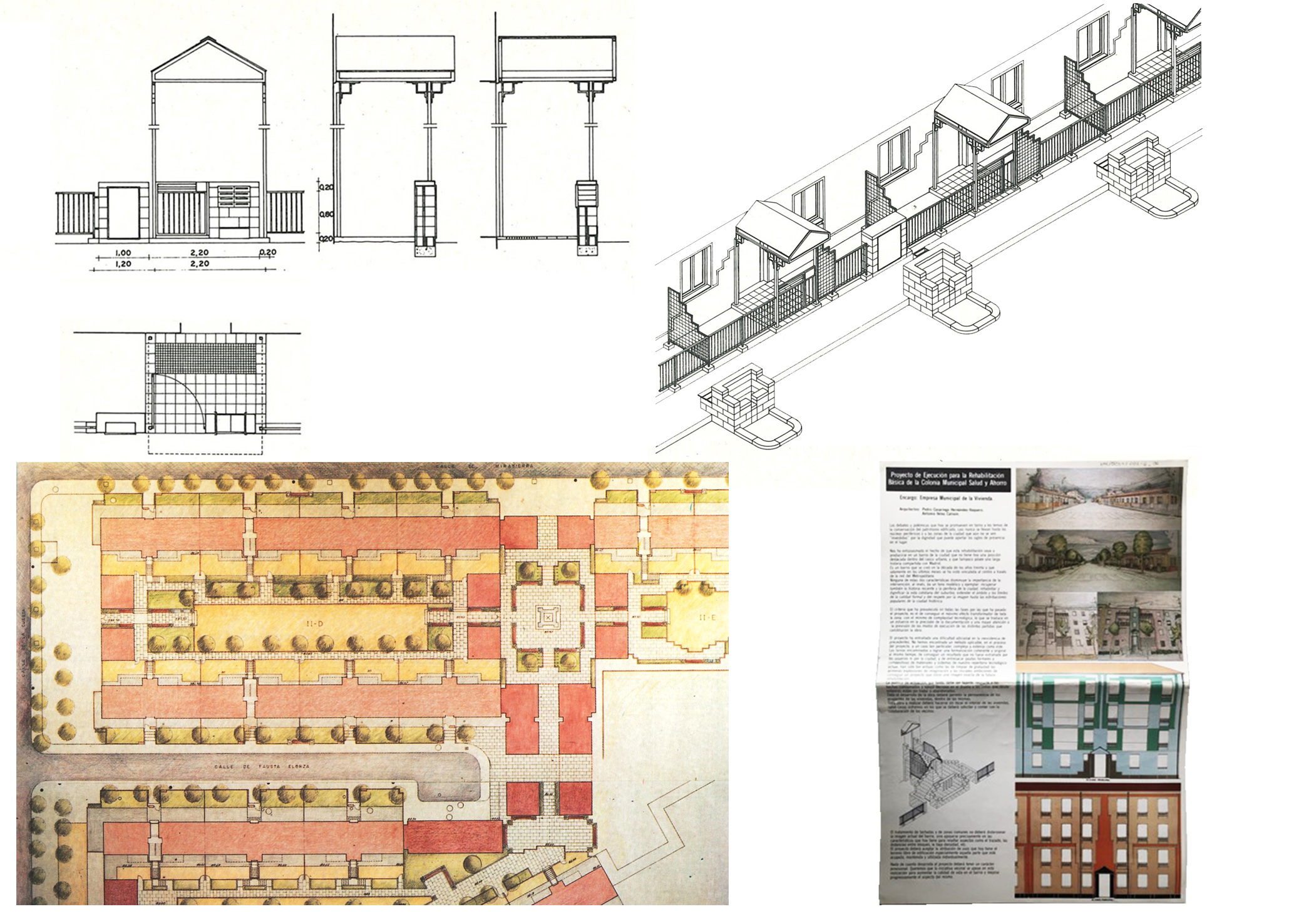 Por último, merece especial atención, por el valor que tienen para en el proceso de participación ciudadana que se llevó a cabo, las imágenes del proyecto de ejecución realizadas en 1982 para transmitirlo a los vecinos, donde se comparan situaciones previas a las intervenciones que se anuncian. Sobre todo, las relacionadas con la calidad del espacio urbano y la vida cotidiana a la que se hace mención en la memoria. En ellas se puede apreciar fácilmente la eliminación del cableado, tratamiento de zócalos, creación de anteportales, y sobre todo mucha mayor presencia de arbolado y de vegetación en los maceteros de las viviendas de planta baja. El reflejo de la asociación de vecinos en la memoria, así como la atención a la vida cotidiana como argumento de proyecto, parece lógico que pueda devenir de los movimientos sociales y vecinales como los que tuvieron lugar en el Poblado Dirigido de Orcasitas desde 1974 hasta 1975, un movimiento vecinal no muy alejado de la Colonia Moscardó (Cervero-Sánchez, 2020).