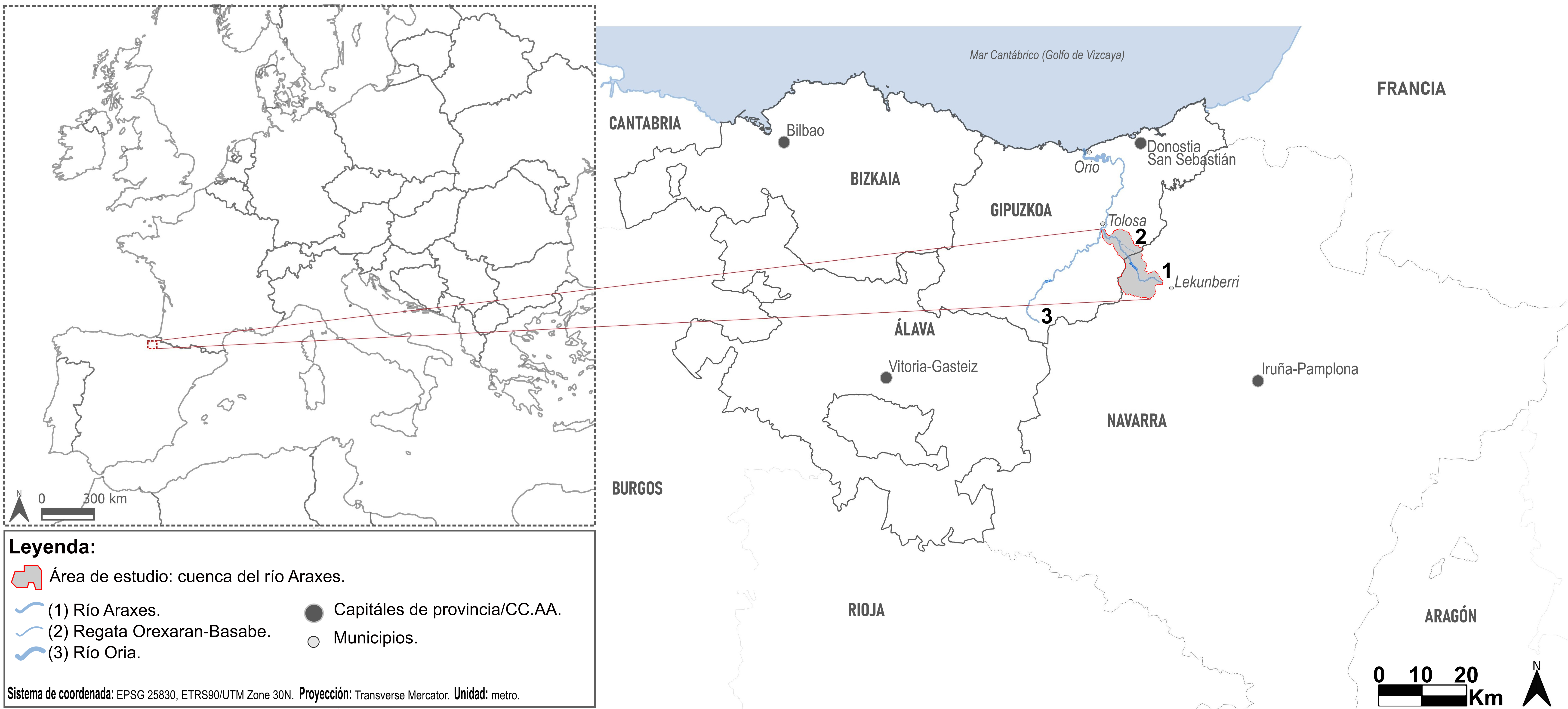La cuenca del Araxes, afluente del río Oria, se localiza en el noroeste de la Comunidad Foral de Navarra (CFN) (70 km2) y el sureste de la provincia de Gipuzkoa (33,9 km2, Comunidad Autónoma del País Vasco (CAPV)). En ella se ubican 10 municipios (Lizartza, Orexa, Gaztelu, Altzo, Leaburu y Tolosa —el de mayor entidad, con 20 065 habitantes— en Gipuzkoa; y Araitz, Betelu, Areso, Larraun en Navarra) en un amplio entorno rural, sin grandes infraestructuras y en el que la población total se acerca a los 24 000 habitantes (Instituto Nacional de Estadística, 2024). Los núcleos de población se dispersan por las laderas de la sierra de Aralar y los montes de Otsabio, Larte-Erroizpe, Malkoraundi o Elosta, así como por los fondos del valle en los márgenes del río Araxes, donde también se encuentra la villa de Tolosa y lugar en el que Araxes confluye con el río Oria (Fig. 1).