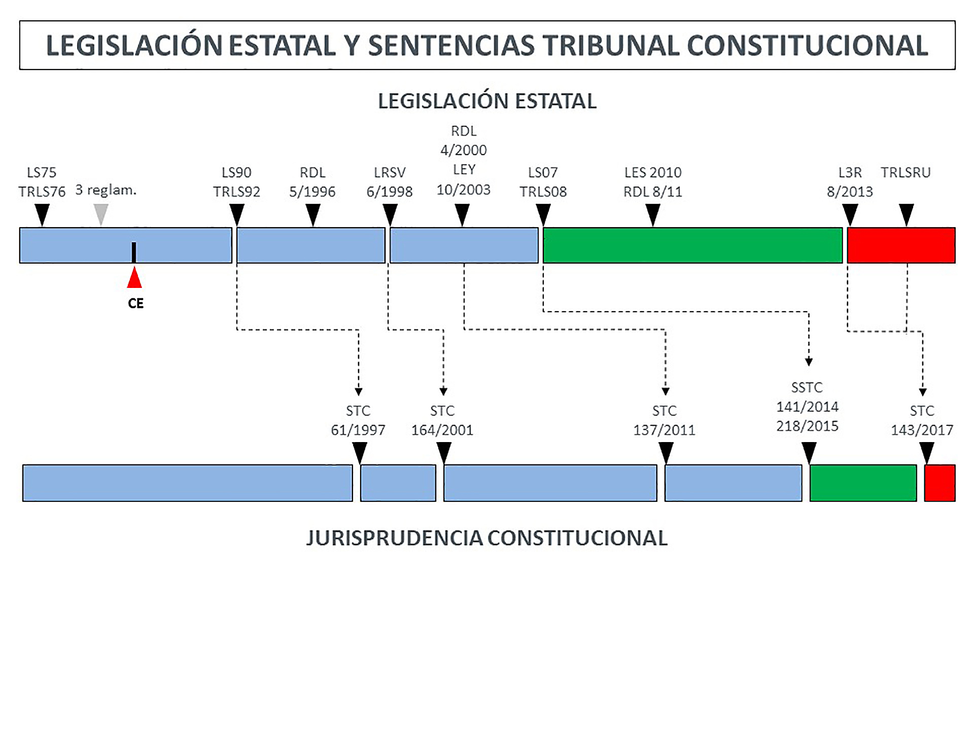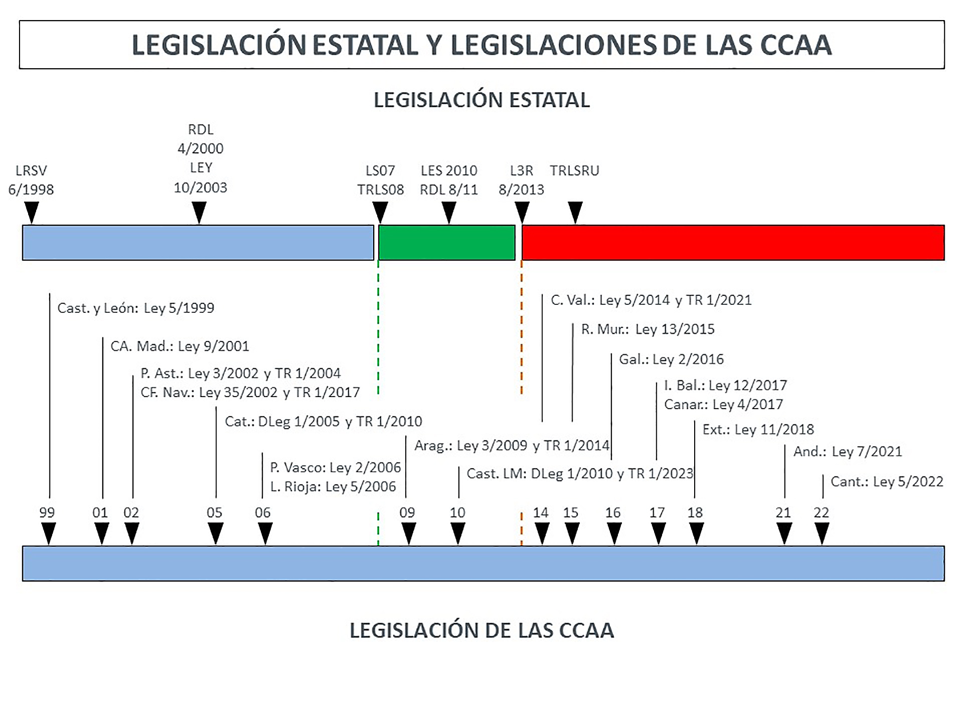 No me gustaría terminar esta introducción sin añadir una valoración de fondo sobre la tensión competencial Estado-Comunidades Autónomas muy viva desde 1997. La llamada de atención de la Exposición de Motivos a la contribución leal de las diversas competencias concurrentes en la materia deja mucho que desear y como muestra la línea temporal que mostramos a continuación) en la que se refleja la ausencia de procesos legislativos participados y con altos niveles de consenso, que traen como consecuencia la elevación permanente de los mismos a rango de discusión constitucional con las nefastas consecuencias para el ordenamiento en cuanto a la seguridad jurídica (las leyes nacen sub judice) y los efectos (normalmente ex tunc) de las declaraciones de inconstitucionalidad. Vivimos en ordenamientos urbanísticos siempre temporales e inacabados. La judicialización permanente no contribuye en medida alguna a fortalecer los mecanismos de implantación y cohonestación que desde una visión ciertamente actual, que se sustente en el Desarrollo Urbano Sostenible e Integrado, y se oriente a nuevas formas de intervención integral en el medio urbano a través de actuaciones que flexibilicen los planes y no hagan depender el proceso de ejecución de la propiedad del suelo que pretende el legislador estatal, pero que ha de ser completado por la legislación autonómica.