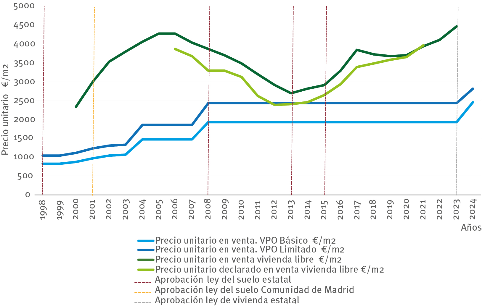 La desvinculación entre el precio de la vivienda y la facilidad de incorporar suelo al mercado es de tal calibre que diez años después de la aprobación de la LRSVS 6/98, la ciudad de Madrid presentaba un incremento acumulado de precio del 73%. Los años posteriores a la aprobación de la RDL 2/2008, coincidentes con el pinchazo de la burbuja inmobiliaria, hubo un desplome de los precios que retomaron su despliegue a partir de 2015, con años de tasas que superaban el 10% (2017 y 2018), que tras el parón correspondiente a 2020, vuelven a estar en tasas que superan el 5%, valores que superan con creces la inflación de los precios.