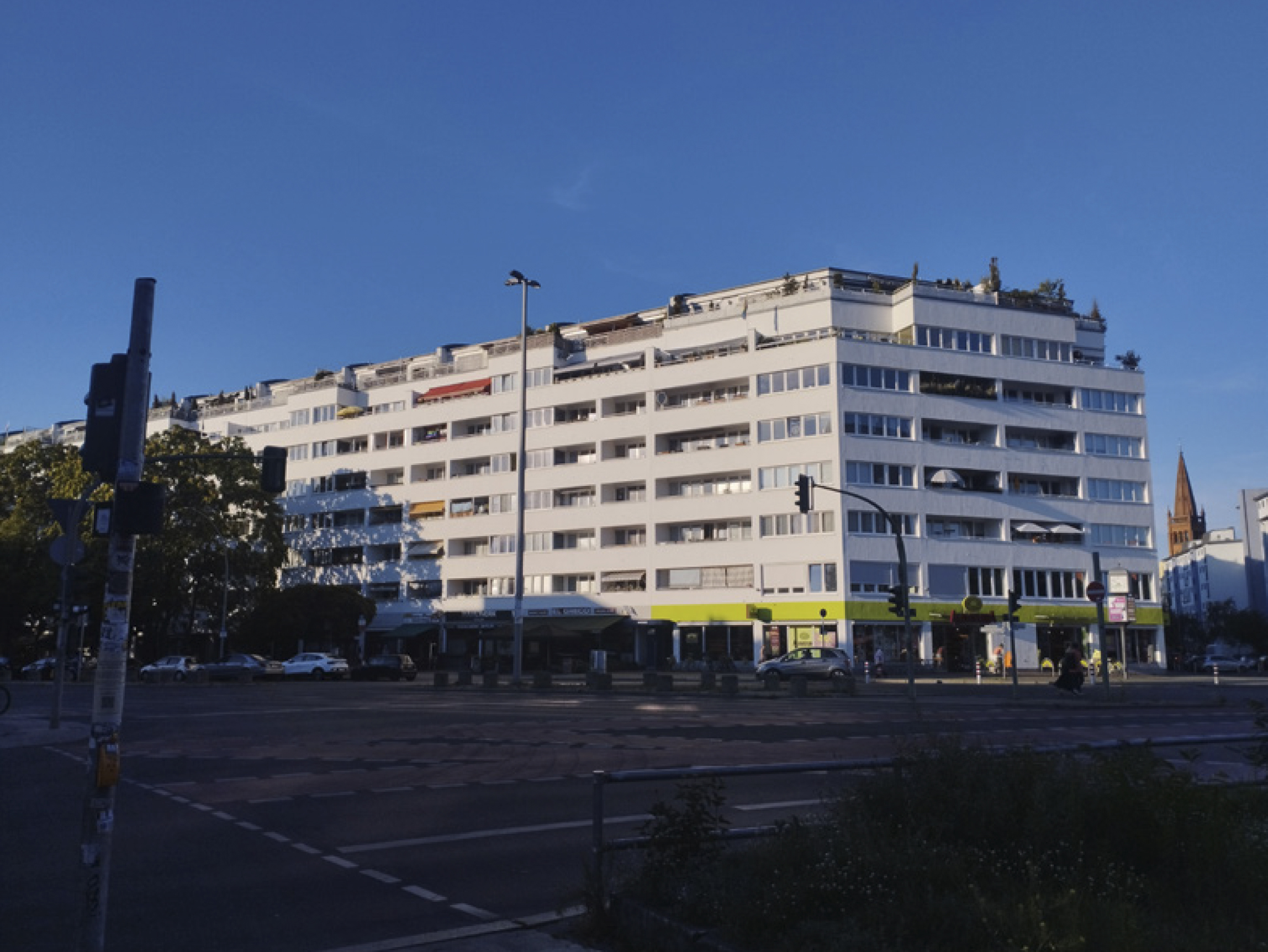 Resulta difícil, al asomarse desde la preciosa estación elevada de U-Bahn de Nollendorfplatz, en Berlín-Schöneberg, relacionar el aparentemente anodino edificio blanco que cierra el vértice nororiental de la plaza (Fig. 1) con la morfología urbana hegemónica en la práctica totalidad de los desarrollos urbanos de los últimos 50 años en España. Se trata de un edificio residencial, de seis plantas más áticos, que alberga aproximadamente 300 viviendas y locales comerciales. El edificio se alinea a dos calles, la Else-Lasker-Schüler Strasse y la Karl-Heinrich-Ulrich Strasse, que comunica con el cercano Tiergarten, situando la fachada sobre la propia alineación de las calles (ello no es exacto en lo que respecta a la segunda, donde se trata de una disposición paralela ligeramente retranqueada). La estructura del edificio se basa en la repetición modular de unidades de fondo edificado de aproximadamente doce metros, cada unidad con una caja de escaleras que permite acceso a dos viviendas, simétricas, por planta: un bloque lineal canónico con una variante necesaria en el diseño del quiebro que conforma la esquina achaflanada.
