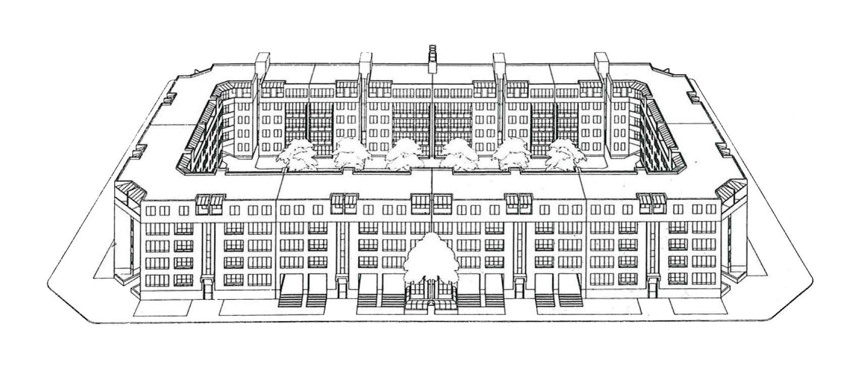 La Manzana 270 (Fig. 2) , proyectada y construida en los primeros setenta, se justifica en la recuperación de las trazas del Plan Hobrecht en el entorno de la Vinetaplatz. Pero aquí no es una larga V o L, con vocación de extenderse longitudinalmente sobre la totalidad de la alineación del lote disponible, sino un bloque lineal que se pliega en cada esquina y se cierra sobre sí mismo, no una sucesión de segmentos diversos sino un edificio único.