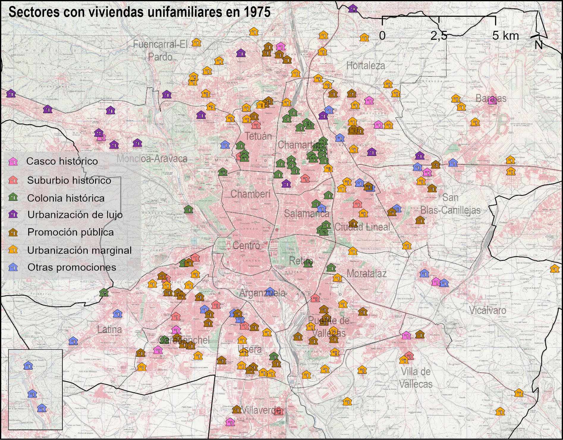 Como se menciona en la metodología, se han identificado nueve paisajes residenciales de vivienda unifamiliar en el área urbana madrileña que diferencian siete pioneros (casco histórico, suburbio histórico, colonia histórica, urbanización de lujo, promoción pública, urbanización marginal y otras promociones), presentes en 1975 y dos de desarrollo posterior, correspondientes a las promociones modernas destinadas a las clases populares y medias en sus opciones formal e informal. Se trata de las parcelaciones catalogadas como ilegales, inicialmente de segunda residencia, convertidas con el tiempo en primera, y las urbanizaciones masivas, con los adosados como protagonistas. Ambos han sido modelos fundamentales de expansión primero sobre el área metropolitana y con posterioridad sobre la segunda y tercera coronas y, más allá, sobre los municipios mejor comunicados de las inmediatas provincias de Toledo y Guadalajara.