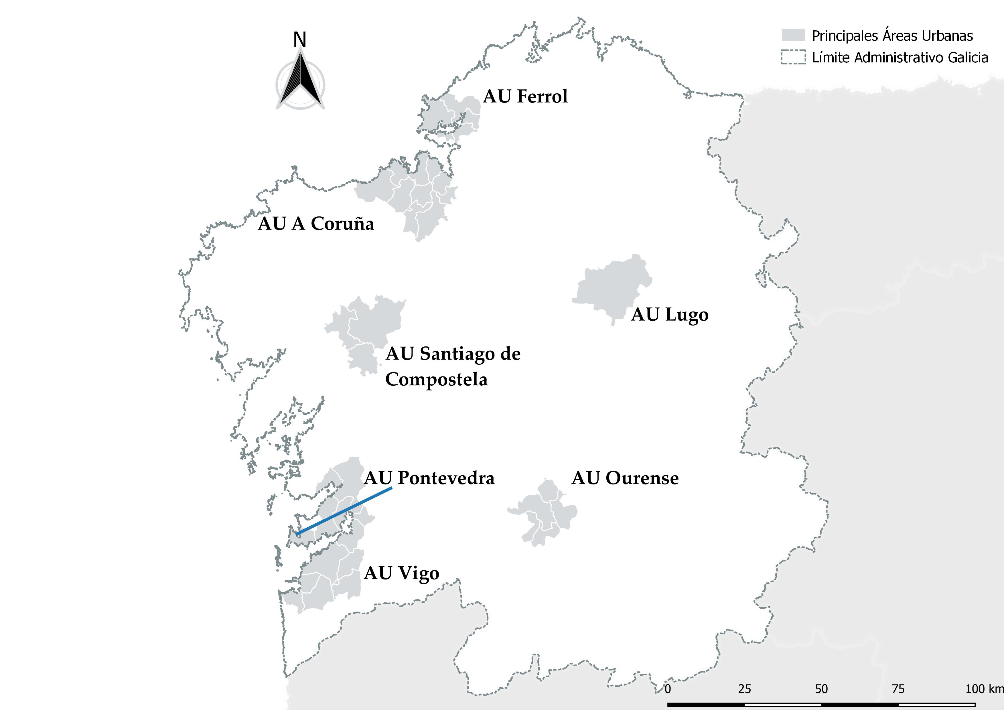 El resultado ha sido, el desarrollo de un proceso que se hizo más agresivo desde finales de la década de 1990, lo que algunos autores han denominado la fiebre del ladrillo (Gaja, 2017), basada en una hiperproducción del sector inmobiliario, que va a incidir de manera notable en el carácter de la urbanización (Burriel de Orueta, 2008). Comenzaba así una etapa que muchos autores han denominado “la década prodigiosa del urbanismo español”. (Bellet & Andrés López, 2021; Burriel, 2008; Górgolas, 2019) El suelo urbanizable es desarrollado siguiendo las reglas del mercado inmobiliario: es comprado y vendido por su valor económico y financiero (Gaja, 2008; Lois & Piñeira Mantiñán & Vives, 2016). El resultado es un desparrame de la ciudad más allá de las periferias próximas -llegando a alcanzar los 50-60 km en grandes urbes y 10-20 km en ciudades medias (Lennert & al., 2012; Zoido & al., 2013), y el crecimiento/consolidación de algunos núcleos que a medio plazo se van a convertir en ciudades de tamaño medio. Por lo que, el proceso de metropolitanización español, se ha caracterizado como un fenómeno posfordista a escala global, resultado de un modelo económico basado principalmente en la construcción, pero en el que también han influido la mejora de las infraestructuras de comunicación, el incremento de la movilidad individual y el tensionamiento de los mercados inmobiliarios de los centros urbanos. Como consecuencia, uno de los aspectos más críticos que se derivaron del auge constructivo, fue la intensa artificialización del territorio con el respaldo de un planeamiento urbano producto de una política territorial con un marcado carácter economicista (mercantilista) (Górgolas, 2017). Desde 2007, tras la aprobación de la Ley del suelo que deroga la anterior LRSV 1998, existe un giro en el derecho urbanístico hacia la sostenibilidad y la regeneración urbana, tras la última aprobación en 2015 del texto refundido de la Ley de suelo y Rehabilitación urbana (en adelante TRLSRU). La TRLSRU parece romper con dos de las dinámicas arrastradas en el período 1990-2007. Por un lado, el texto refundido, aglutina y simplifica en una norma la regulación estatal que afecta a la ordenación del territorio y urbanismo. Por otro, parece que cambia la tradición urbanística expansiva que se venía desarrollando, por centrarse en el mantenimiento, rehabilitación y recuperación del tejido urbano consolidado (Ortega Moreno, 2021). En la actualidad, parece reflejarse un cambio en la aplicación de políticas urbanas en las ciudades españolas, pero en las que todavía coexiste la tendencia expansiva anterior, sólo que orientado a explotar las plusvalías de espacios centrales mejor localizados, así como un nuevo urbanismo apoyado en lo participativo, transversal y alejándose de lo tecnocrático. (Bellet, 2020) Por lo mencionado, el objetivo de este trabajo es abordar el resultado de las prácticas que se han desarrollado para la producción del espacio urbano en la Comunidad Autónoma de Galicia. Para ello, nos hemos fijado mostrar una breve visión teórica del proceso de urbanización de Galicia desde mediados del S.XX hasta la actualidad. Esta dará pasó y se complementará con una revisión legislativa y de la planificación territorial aplicada en la región. Por último, terminar realizando un análisis evolutivo mediante una serie de indicadores demográficos, inmobiliarios-constructivos y de ocupación del suelo que nos permiten analizar el crecimiento de las ciudades gallegas. Esto permitirá aportar información, relacionar tendencias y mostrar los cambios acaecidos en el territorio como el incremento de la artificialización del suelo, mostrando así los desequilibrios territoriales existentes. Para ello, centraremos el análisis en las principales áreas urbanas gallegas, ajustando el análisis a las delimitaciones propuestas por el Ministerio de Vivienda y Agenda Urbana en el informe de delimitación de áreas urbanas de España de 2023. 2. Las transformaciones urbanas de Galicia Desde mediados del siglo XX, la expansión de las ciudades y de sus zonas urbanas periféricas ha sido el cambio más significativo en la organización territorial de Galicia (Lois & Pino, 2015). El territorio gallego llegó a estas décadas siendo considerado pobre y atrasado, con una economía subsidiaria, grandes déficits estructurales y cerrado al mundo exterior, sin espacio para la modernización y el dinamismo (Beiras, 1972). Sin embargo, en ese momento comenzaron a ocurrir cambios que transformarían estructuralmente la sociedad y la economía de Galicia y, en consecuencia, la ocupación de su territorio y los procesos de urbanización asociados. Las consecuencias de este proceso fueron un rápido crecimiento de la población urbana, un aumento del espacio edificado y, a nivel económico, un mayor peso de la industria y servicios (Souto Gonzalez, 1988). La transformación ha sido acelerada por la entrada de España en la Comunidad Económica Europea en 1986. A partir de entonces, Galicia fue la segunda región española, después de Andalucía, que más fondos regionales europeos recibió entre 1989 y 2020. (Molina Ibáñez & Pérez Campaña & Hernando Sanz, 2022) Esto garantizó la mejora de sus infraestructuras, la modernización de su industria y el desarrollo de los espacios rurales. Galicia, se integró rápidamente en la economía global, gracias a una importante reestructuración en sectores clave como el lácteo y la construcción naval. Como consecuencia, ha habido un profundo cambio en la estructura productiva de Galicia, con el paso de una agricultura precapitalista y autárquica hacia un nuevo sistema de producción que generó excedentes de mano de obra rural y favoreció el trasvase de población hacia áreas urbanas de base industrial (Rodríguez González, 1999). Fig. 1 Áreas Urbanas de Galicia Fuente: Elaboración propia Es entre 1960 y 1980 que se nota u