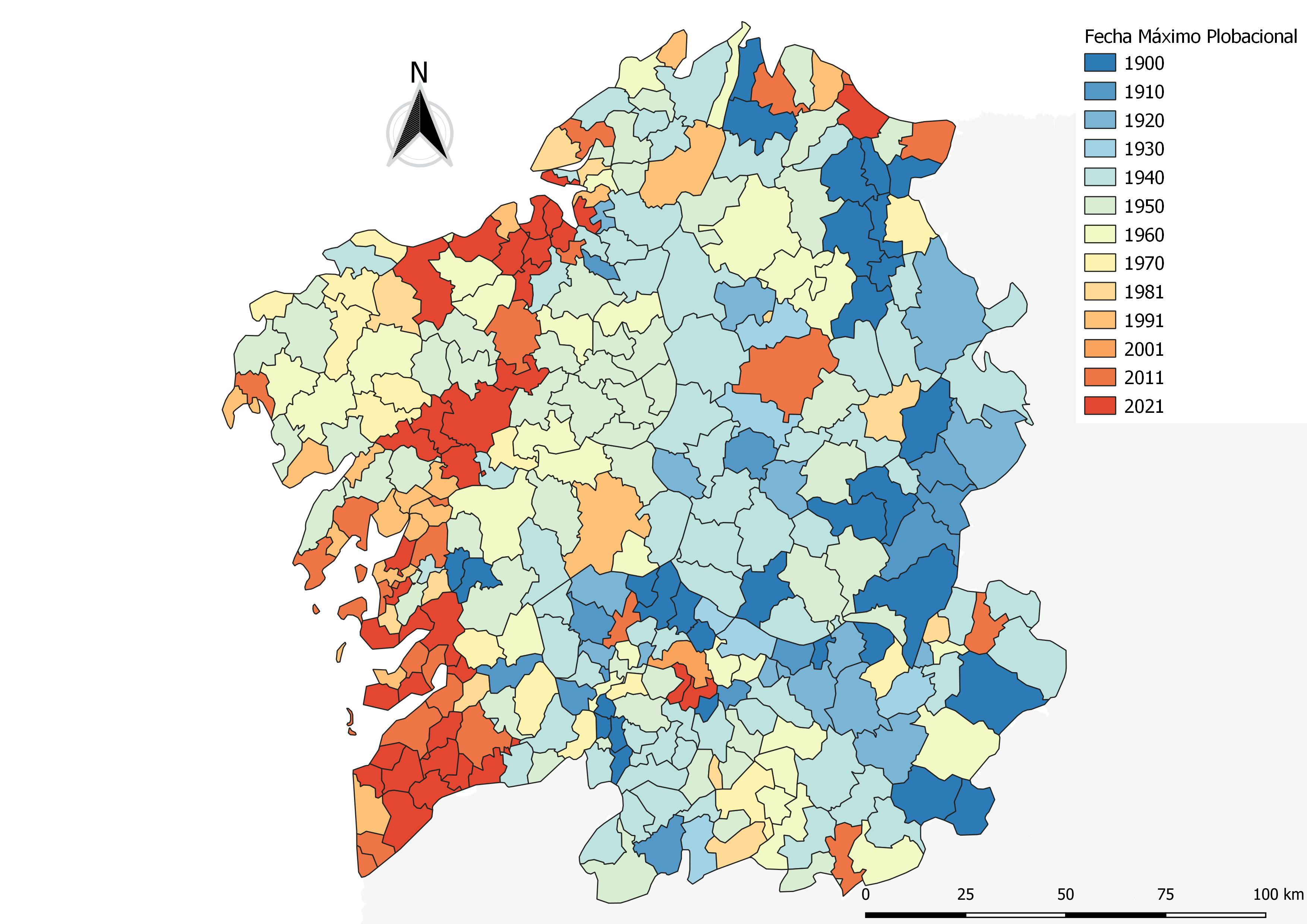 Las ciudades de A Coruña, al norte, y Vigo, al sur del Eje Urbano Atlántico, son los principales centros demográficos y económicos. A Coruña forma un área metropolitana con Ferrol, mientras que Vigo forma otra con Pontevedra, alcanzando ambas conglomeraciones un volumen poblacional de, aproximadamente, medio millón de habitantes. Las tres ciudades restantes, Lugo, Ourense y Santiago, funcionan como ciudades de segundo nivel, aunque desempeñan un papel crucial en la articulación territorial. Santiago, ubicada dentro del Eje Urbano Atlántico, es la capital política de la región, mientras que Lugo y Ourense, situadas fuera del Eje Urbano Atlántico, organizan el espacio interior y rural de Galicia. 1960 1981 ∆ 1960 - 1981 2001 ∆ 1981 - 2001 2021 ∆ 2001 - 2021 Galicia 2 730 996 2 811 912 2,96% 2 732 926 -2,81% 2 695 645 -1,36% Áreas Urbanas (total) 907 316 1 252 330 38,03% 1 403 685 12,09% 1 510 582 7,62% AU A Coruña 250 804 320 746 27,89% 370 725 15,58% 418 955 13,01% A Coruña (municipio) 177 502 231 721 30,55% 239 434 3,33% 245 468 2,52% Otros municipios del AU A Coruña 73 302 89 025 21,45% 131 291 47,48% 173 487 32,14% AU Ferrol 116 780 145 954 24,98% 136 579 -6,42% 126 788 -7,17% Ferrol (municipio) 74 799 87 691 17,24% 80 347 -8,37% 64 785 -19,37% Otros municipios del AU FERROL 41 981 58 263 38,78% 56 232 -3,49% 62 003 10,26% AU Lugo 58 264 72 574 24,56% 88 901 22,50% 97 613 9,80% AU Ourense 83 429 110 821 32,83% 127 717 15,25% 130 722 2,35% Ourense (municipio) 64 153 94 346 47,06% 109 051 15,59% 104 596 -4,09% Otros municipios del AU OURENSE 19 276 16 475 -14,53% 18 666 13,30% 26 126 39,97% AU Pontevedra 76 491 99 425 29,98% 115 642 16,31% 124 592 7,74% Pontevedra (municipio) 50 483 64 184 27,14% 75 864 18,20% 83 114 9,56% Otros municipios del AU Pontevedra 26 008 35 241 35,50% 39 778 12,87% 41 478 4,27% AU Santiago de Compostela 78 283 103 002 31,58% 126 012 22,34% 148 629 17,95% Santiago de Compostela (municipio) 57 173 82 404 44,13% 93 381 13,32% 97 858 4,79% Otros municipios del AU Santiago de Compostela 21 110 20 598 -2,43% 32 631 58,42% 50 771 55,59% AU Vigo 243 265 399 808 64,35% 438 109 9,58% 463 283 5,75% Vigo (municipio) 144 914 261 331 80,34% 287 282 9,93% 293 837 2,28% Otros municipios del AU Vigo 98 351 138 477 40,80% 150 827 8,92% 169 446 12,34% Fig. 2 Evolución de la población residente en las Áreas Urbanas de Galicia (1960-2021) Fuente: Elaboración propia a partir de datos del INE (varios años) En términos de crecimiento, las áreas urbanas de Galicia han experimentado diferentes etapas de transformación. A diferencia del crecimiento centrípeto observado en los años 60, a partir de los 80 predominó un tipo de crecimiento centrífugo en áreas urbanas como A Coruña, Ourense, Santiago de Compostela y Vigo, donde las periferias lideraron la expansión de los límites de las ciudades. Esto se refleja en los datos de la Fig.2: mientras que entre 1960 y 1981 los municipios centrales fueron los principales protagonistas del crecimiento poblacional, en las décadas siguientes los municipios periféricos absorbieron la mayor parte del crecimiento de las áreas urbanas. Esta tendencia es tan evidente que los datos de la tabla muestran que entre 2001 y 2021 los roles entre la ciudad central y el resto del área urbana se invirtieron en A Coruña, Santiago de Compostela y Ourense, con la mayor parte de la población residente en estas áreas urbanas viviendo fuera del núcleo central. En la última década esta tendencia se mantuvo, aunque las ciudades principales recuperaron mayores índices de crecimiento debido a dinámicas de retorno urbano, al aumento de la inmigración extranjera (que se concentró principalmente en los municipios centrales), a una nueva valorización del centro de las ciudades y al impacto del estallido de la burbuja inmobiliaria en 2008, que provocó el “abandono” de algunas periferias (González Pérez, 2015). Este proceso tuvo importantes consecuencias territoriales más allá del crecimiento de la población, tales como el crecimiento urbano disperso, la artificialización del suelo, los cambios en la localización de las actividades industriales y terciarias, la modificación de los flujos de movilidad y el desbordamiento de los límites municipales. Según los datos, a pesar de que Galicia perdió 35 000 habitantes entre 1960 y 2021, las siete principales áreas urbanas experimentaron un incremento poblacional del 66% durante el mismo período. En los últimos 20 años, las áreas urbanas con mayor crecimiento fueron A Coruña y Santiago de Compostela, con aumentos del 13% y del 18%, respectivamente. Por otro lado, Pontevedra, Vigo y Lugo tuvieron incrementos inferiores al 10%, mientras que Ourense mostró un modesto crecimiento del 2% y Ferrol experimentó una disminución de la población del 7%. La articulación territorial de Galicia también está definida por un crecimiento desigual entre la costa y el interior (Lois & Piñeira, 2011). Según datos de 2021, las áreas urbanas de Galicia concentran aproximadamente el 56 % de la población, mientras que en 1960 estos mismos territorios albergaban solo el 33% de los habitantes. Mientras tanto, vastas áreas rurales experimentan un declive poblacional. Esta dualidad demográfica enfrenta un litoral dinámico con una región interior deprimida. En esta Comunidad Autónoma se observa una bipolaridad entre un subsistema urbano-industrial en la costa y otro agrario y tradicional en el interior. La Fig. 3 ilustra este fenómeno mostrando el año en el que cada municipio alcanzó su población máxima. En el Eje Atlántico, la mayoría de los municipios alcanzaron sus máximos poblacionales en el siglo XXI, con muchos de ellos registrando estos picos en el último censo de 2021. En contraste, en el interior de Galicia, la mayoría de los municipios alcanzaron sus máximos poblacionales antes de 1960. Algunas excepciones, como las áreas urbanas de Lugo y Ourense, así co